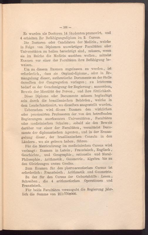 Uebersehen wird dieses Examen den wirklichen oder pensionirten Professoren der von den betreffenden Regierungen anerkannten Universitäten, Facultäten oder medicinischen Schulen, sobald sie den Beweis darüber vor einer der Facultäten, vermittelst Documente der diplomatischen Agenten, und in der Ermangelung dieser, der brasilianischen Consuln in den Ländern, wo sie gelesen haben, führen.