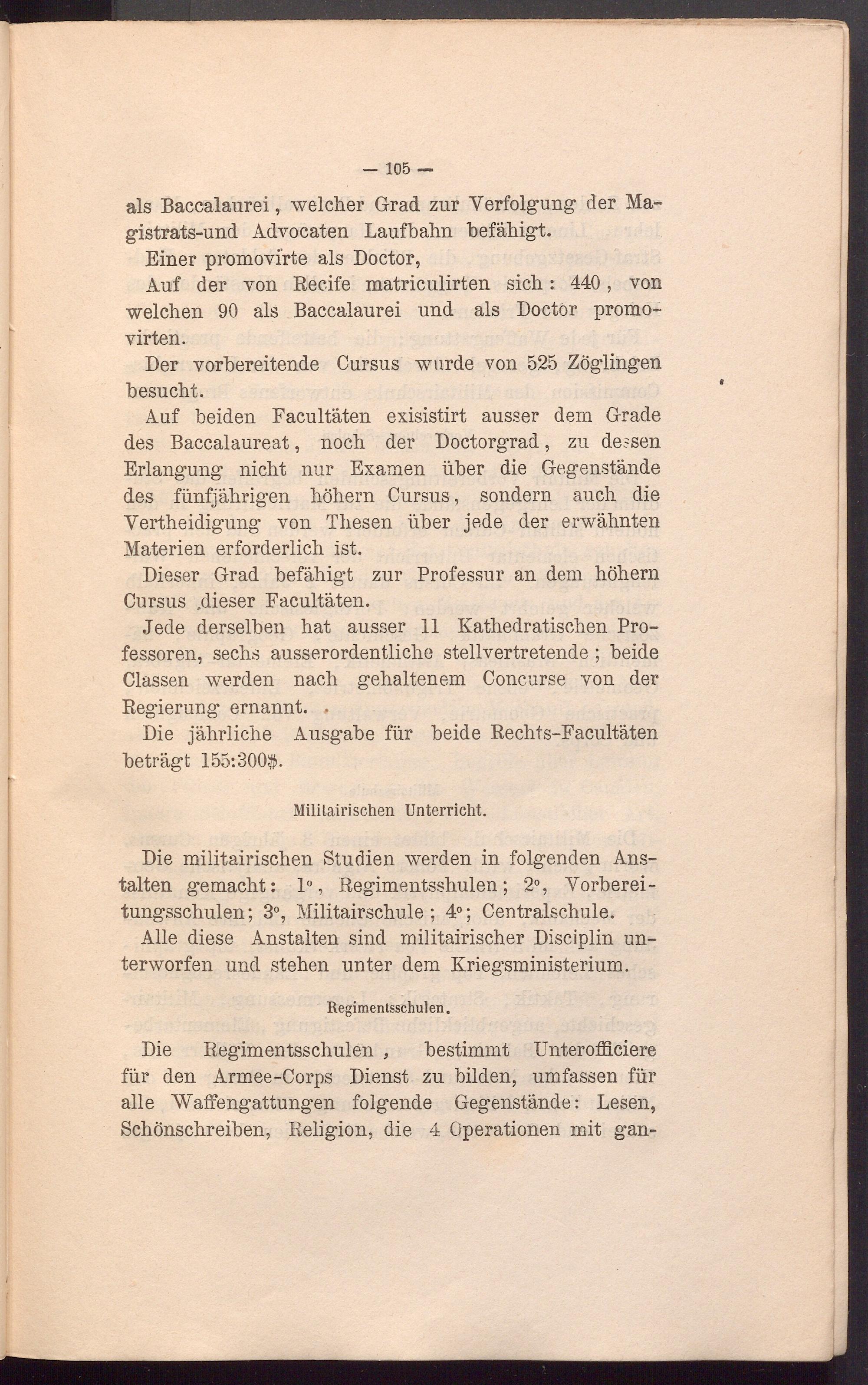 Die Regimentsschulen , bestimmt Unterofflciere für den Armee-Corps Dienst zu bilden, umfassen für alle Waffengattungen folgende Gegenstände: Lesen, Schönschreiben, Religion, die 4 Operationen mit gan-