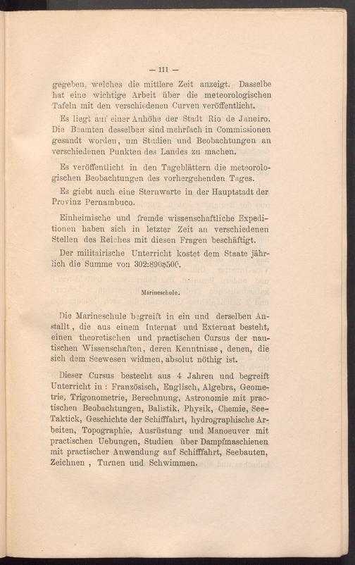 Dieser Cursus bestecht aus 4 Jahren und begreift Unterricht in : Französisch, Englisch, Algebra, Geometrie, Trigonometrie, Berechnung, Astronomie mit practischen Beobachtungen, Balistik, Physik, Chemie, See- Taktick, Geschichte der Schifffahrt, hydrographische Arbeiten, Topographie, Ausrüstung und Manoeuver mit practischen Uebungen, Studien über Dampfmaschienen mit practischer Anwendung auf Schifffahrt, Seebauten, Zeichnen , Turnen und Schwimmen.