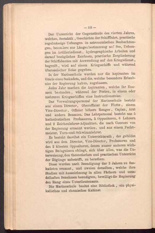 Der Unterricht der Gegenstände des vierten Jahres, welches, Seetaktik , Geschichte der Schifffahrt, practische regelmässige Uebungen in astronomischen Beobachtungen, besonders zur Längenbestimmung auf See, Uebungen im Artilleriedienst, hydrographische Arbeiten und darauf bezügliches Zeichnen, practische Zergliederung der Schiffsbauten mit Anwendung auf den Kriegsdienst r begreift, wird auf einem Kriegsschiffe und während überseeischer Reise gegeben.