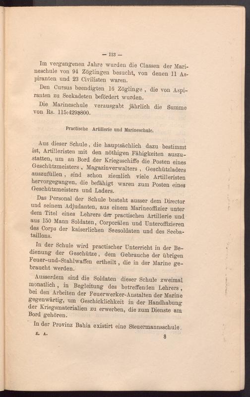Ausserdem sind die Soldaten dieser Schule zweimal monatlich, in Begleitung des betreffenden Lehrers, bei den Arbeiten der Feuerwerker-Anstalten der Marine gegenwärtig, um Geschicklichkeit in der Handhabung der Kriegsmaterialien zu erwerben, die zum Dienste am Bord gehören.