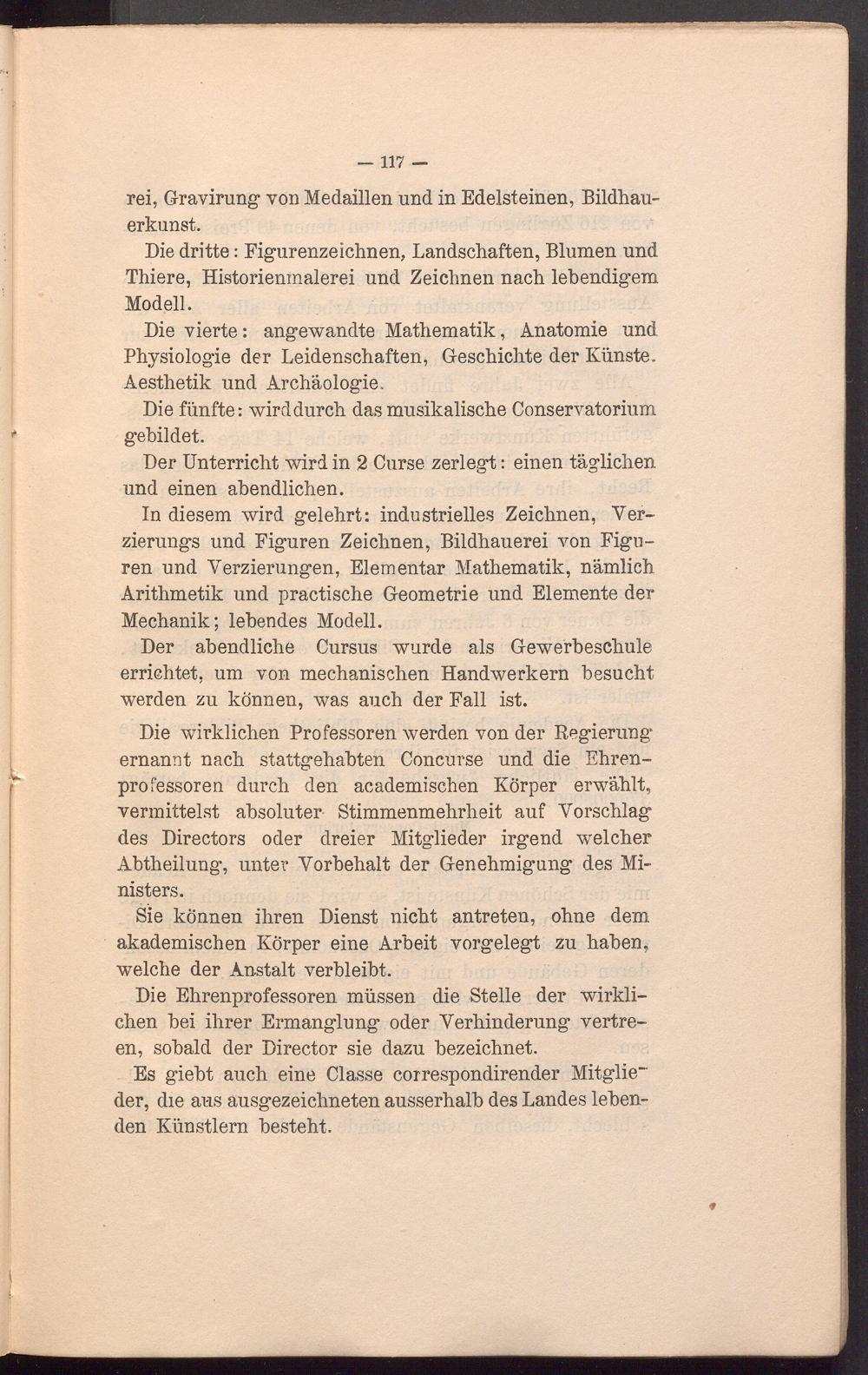 In diesem wird gelehrt: industrielles Zeichnen, Ver- zierungs und Figuren Zeichnen, Bildhauerei von Figuren und Verzierungen, Elementar Mathematik, nämlich Arithmetik und practische Geometrie und Elemente der Mechanik; lebendes Modell.