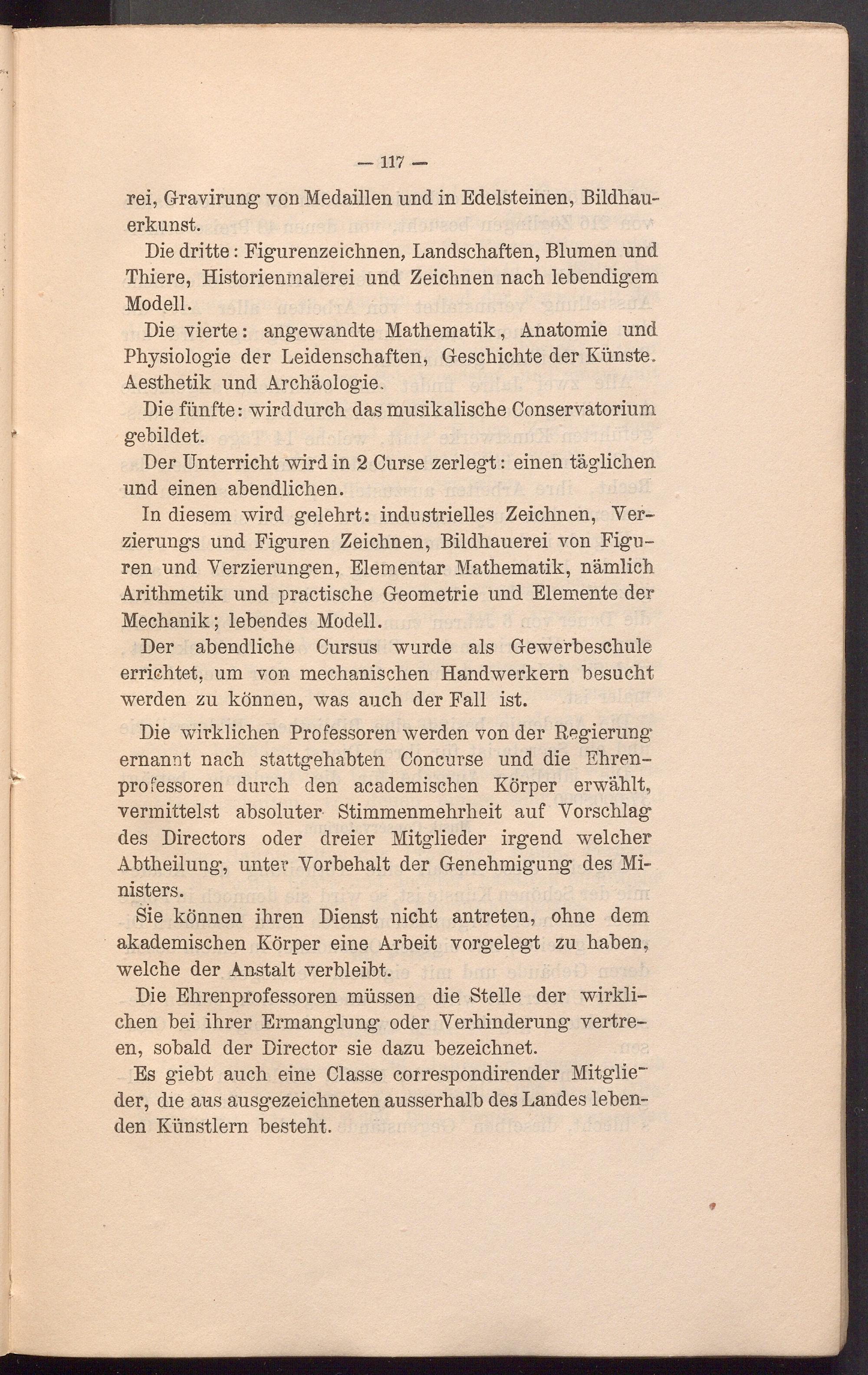 Die wirklichen Professoren werden von der Regierung' ernannt nach stattgehabten Concurse und die Ehrenprofessoren durch den academischen Körper erwählt, vermittelst absoluter Stimmenmehrheit auf Vorschlag des Directors oder dreier Mitglieder irgend welcher Abtheilung, unter Vorbehalt der Genehmigung des Ministers.