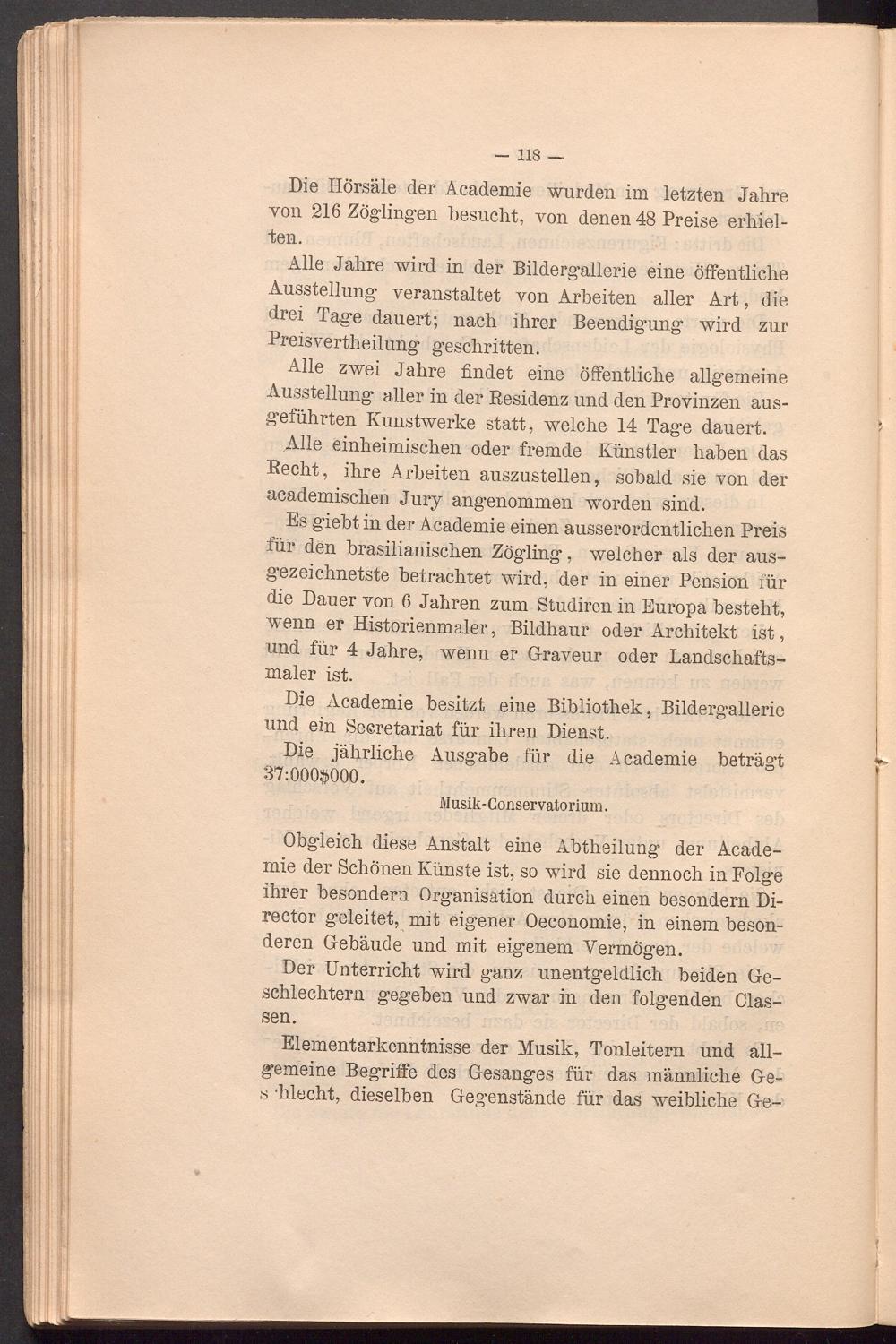 Es giebt in der Academie einen ausserordentlichen Preis für den brasilianischen Zögling, welcher als der ausgezeichnetste betrachtet wird, der in einer Pension für die Dauer von 6 Jahren zum Studiren in Europa besteht, wenn er Historienmaler, Bildhaur oder Architekt ist, und für 4 Jahre, wenn er Graveur oder Landschaftsmaler ist.