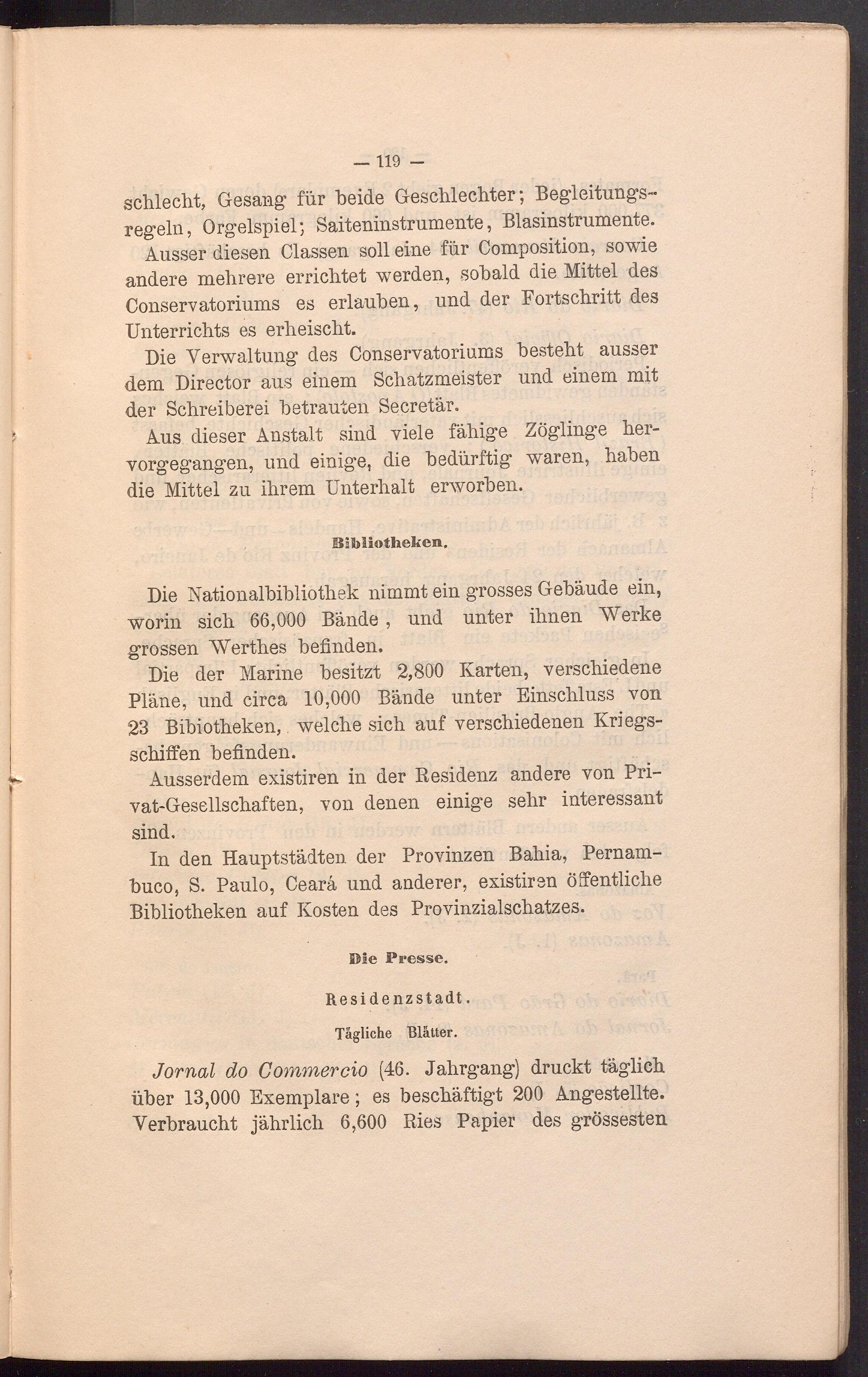 In den Hauptstädten der Provinzen Bahia, Pernam- buco, S. Paulo, Cearä und anderer, existiren öffentliche Bibliotheken auf Kosten des Provinzialschatzes.