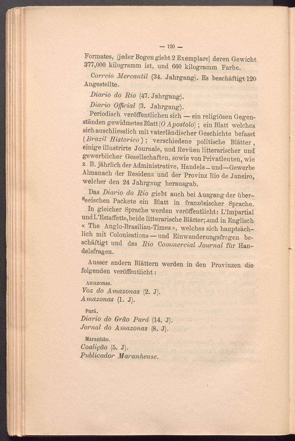In gleicher Sprache werden veröffentlicht: LTmpartial undL’Estaffette,beide litterarische Blätter;«und in Englisch « The Anglo-Brasilian-Times», welches sich hauptsächlich mit Colonisations — und Einwanderungsfragen beschäftigt und das Rio Gommercial Journal für Handelsfragen.