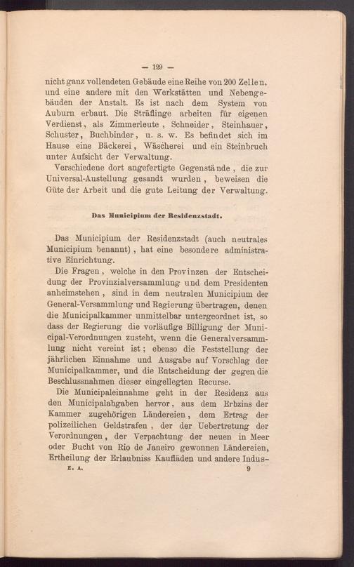 Die Municipaleinnahme geht in der Residenz aus den Municipalabgaben hervor, aus dem Erbzins der Kammer zugehörigen Ländereien, dem Ertrag der polizeilichen Geldstrafen , der der Uebertretung der Verordnungen, der Verpachtung der neuen in Meer oder Bucht von Rio de Janeiro gewonnen Ländereien, Ertheilung der Erlaubniss Kaufläden und andere Indus- E. a. 9