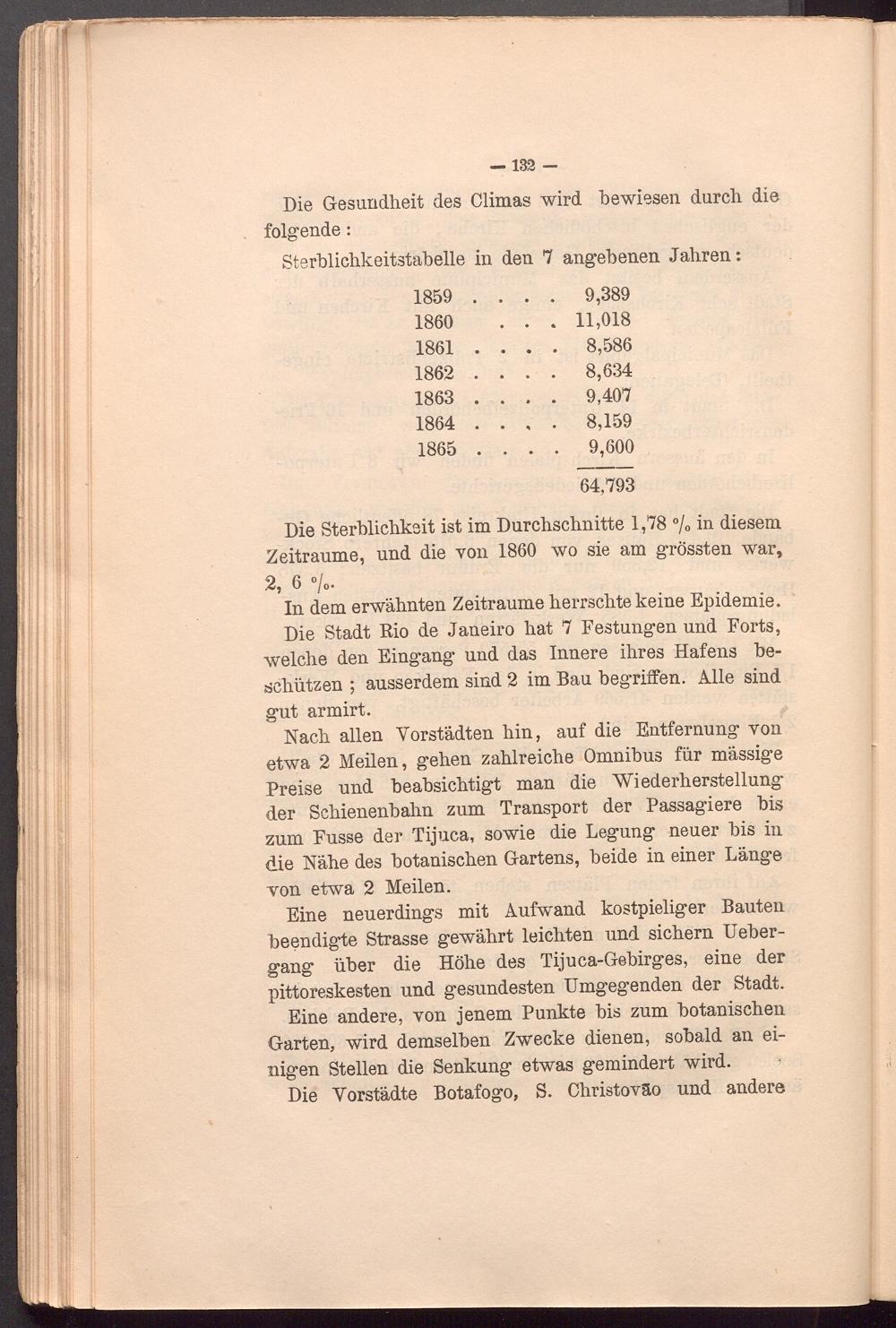 Nach allen Vorstädten hin, auf die Entfernung von etwa 2 Meilen, gehen zahlreiche Omnibus für mässige Preise und beabsichtigt man die Wiederherstellung der Schienenbahn zum Transport der Passagiere bis zum Fusse der Tijuca, sowie die Legung neuer bis in die Nähe des botanischen Gartens, beide in einer Länge von etwa 2 Meilen.