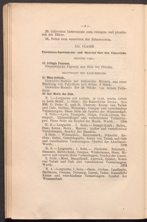 N. 1.—Lorgnette mit Aufsatz in Gold, reiche Arbeit in hoch Relief, 1. Seite; die Kaiserliche Krone, Ihre MM. D. Pedro II. und D. Theresa; Kranz von Tabak und Cafe, Globus, Telescope, Compas und verschiedene Verzierungen. Diese Seite als Symbol der Wissenschaft.