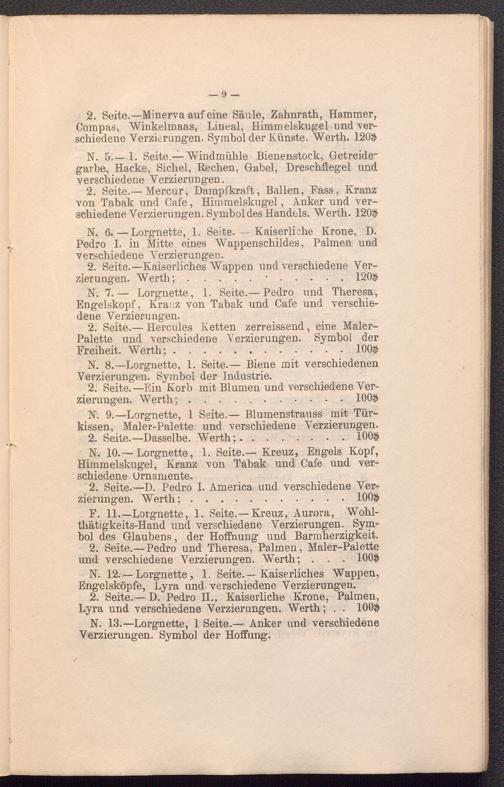 N. 6.—Lorgnette, 1. Seite. — Kaiserliche Krone, D. Pedro I. in Mitte eines Wappenschildes, Palmen und verschiedene Verzierungen.