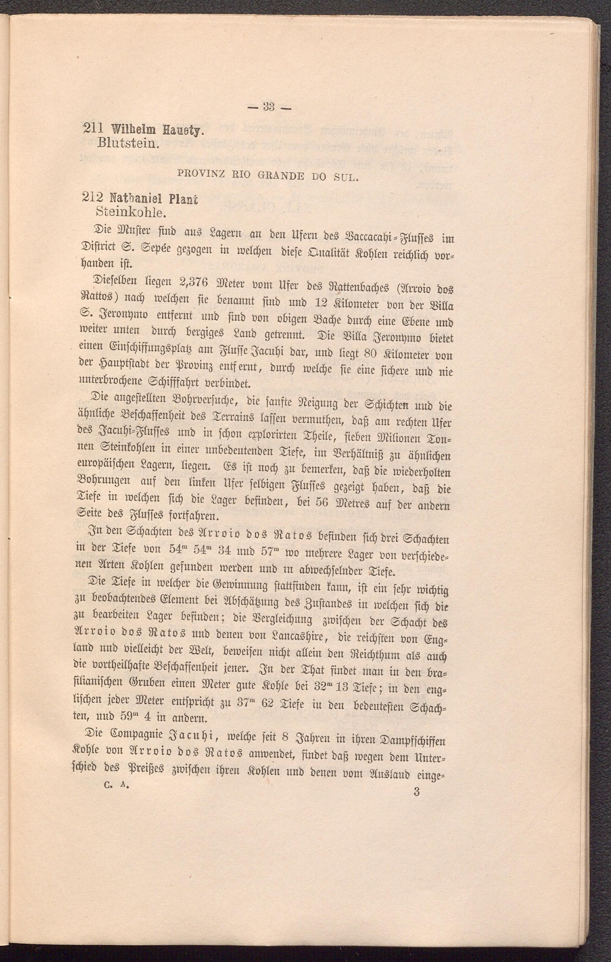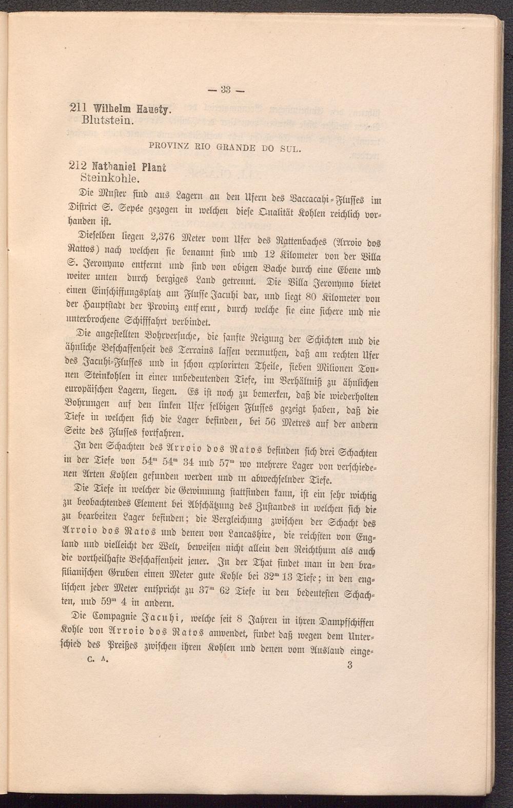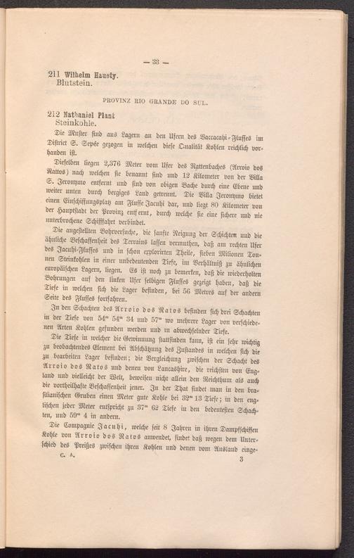 Die angefteltten Voprücrfudfe, bie fanfte 9Mgiutg ber @dj)id)ten unb bie ähnliche Vefcpaffenpeit bes DerrainS laffen oermutpen, bafs am rechten Ufer beS .^acupi^luffeS unb in fcpou e^plorirten Dtieile, fieben SJcitiorten Don* neu ©teinfoplen in einer unbebentenben Diefe, im Verpältnifj gu ähnlichen europäifcpen Sägern, liegen. ©S ift nod) jit bemerfen, baff bie wieberpolten Voprungen auf ben linfen Ufer felbigen ^luffeS gezeigt pal eit, bap bie Diefe in melden fid) bie Säger beftnben, bei 56 SRetreS auf ber anbern ©eite bes gluffeS fortfahren.