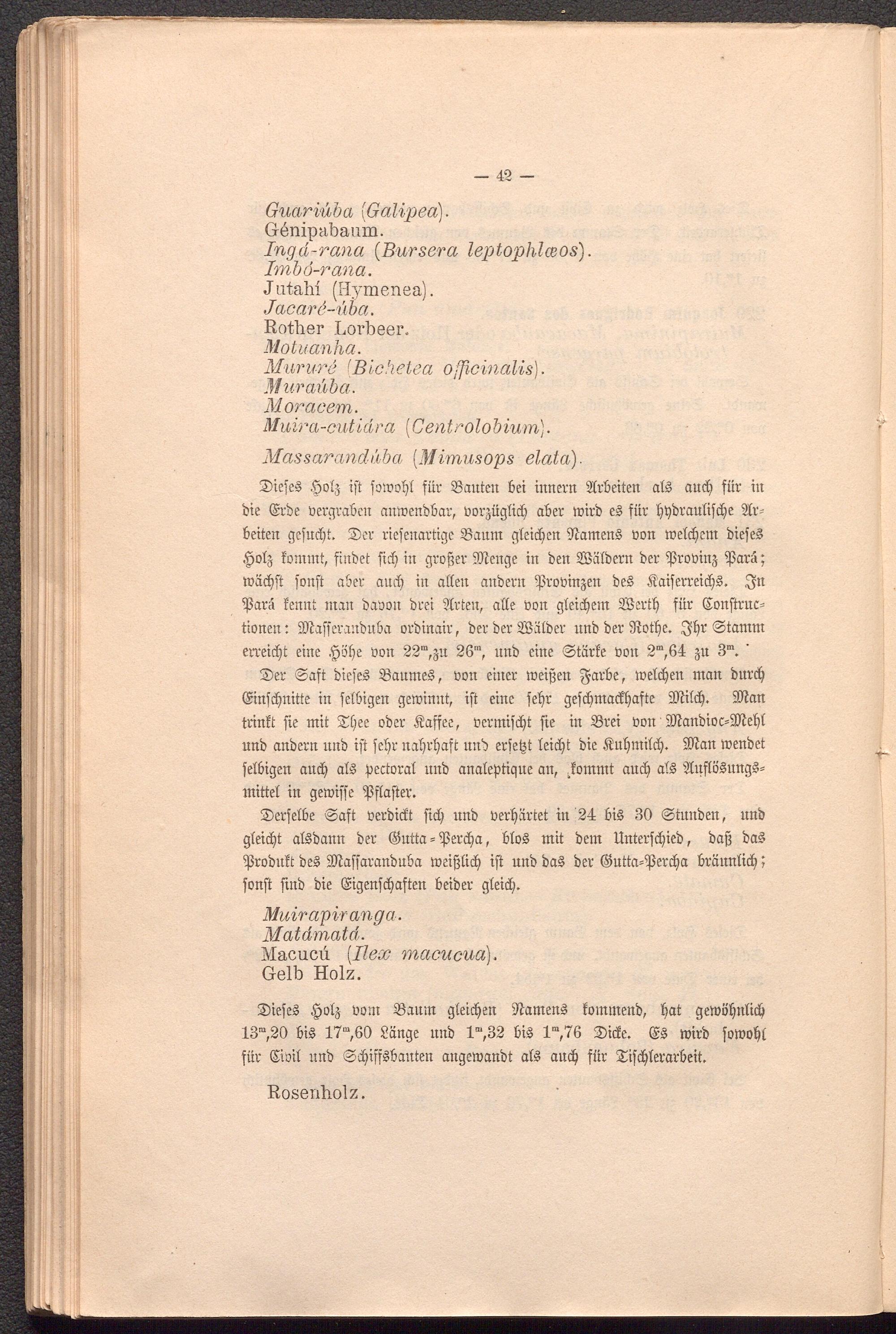 betten gefucpt, 3)er rtefenartigc Saunt gleiten Ramené non metcpem biefe§ § 0(3 fontutt, fiixbet ficp ht grofjer fblettge in ben SBatbern ber ißrobinj iß ara ; tbäcpft fonft aber aucp tn atteu aubent ißrobinjen be§ $aiferreicp$>. $tt $arâ ïennt man bubon bref Sfrteu, atte non gleichem SBertß für ©onftruc* tionen: SOÎafferaitbnba orbinair, ber ber Söätber unb ber fftotße. !jpr Stamm erreicßt eine fpöße bon 22 m , 3 it 26 m , unb eine ©tarie bon 2 m ,64 ju 3 m . '