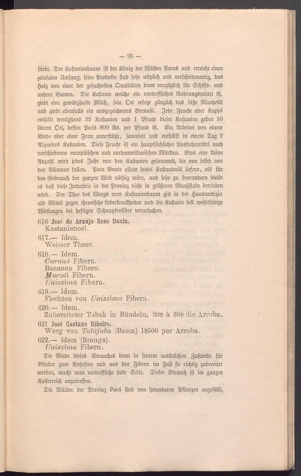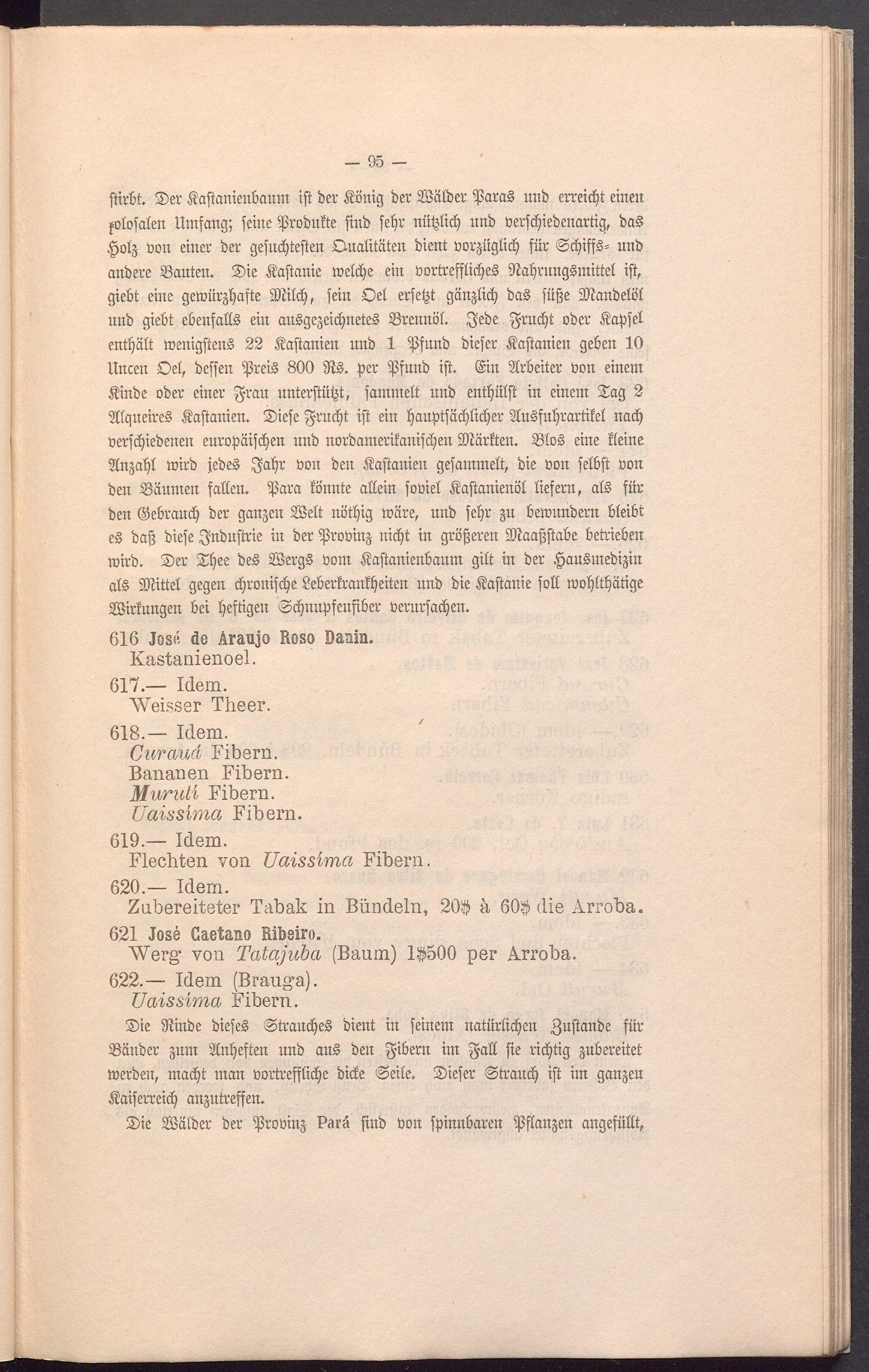 ftirbt. Der üaftanienbaum i[t ber $önig ber SMlber iparaS mtb erreicht einen jolofalen Umfang; feine ißrobufte ftnb feljr mißlich unb berfdjiebenartig, ba§ |jotg non einer ber gefudfteften Dualitäten bient borgügtid) für ©cpiffs^ unb anbere Sauten. Die Äaftanie weiche ein bortrefflidfeS dîahrungSmittel ift, giebt eine gemürghafte iOii(d), fein Del erfeßt gängtid? baS füge iOianbelöl unb giebt ebenfalls ein aitSgegeidfneteS Srennöl. $ebe grutßt ober Zapfet enthält menigftenS 22 ^aftanien unb 1 ißfnnb bief er üaftanien geben 10 Uitceu Del, beffen iß re iS 800 9ÏS. per ißfunb ift. ©in Arbeiter bon einem Äinbe ober einer $rau unterftüßt, fantntelt unb enthütft in einem Dag 2 StlqueireS Äaftanien. Diefe fÇrudjt ift ein Ifauptfacfyticper dCuSfuhrartifel nad) berfdfiebenen europöifdfen unb norbanterifanifdjen dftärften. StoS eine Heine Stngaßt mirb febeS ^aßr boit ben $aftanien gefammelt, bie bon felbft bon ben Säumen fallen, ipara fönnte allein fobiel .ftaftanienol liefern, als für ben (gebrauch ber ganzen 2öett nötßig märe, unb fepr git bemitnbern bleibt es baß biefe $nbuftrie in ber tprobing nicpt in größeren Fiaaßftabe betrieben mirb. Der Dl)ee beS SBergS bom Äaftanienbaum gilt in ber ^auSmebigin als drittel gegen dfronifcpe Seberfrauffjeiten unb bie .flaftaitie foll mopltbätige ÏBirfungen bei heftigen ©dpiupfcnfiber berurfatpen.