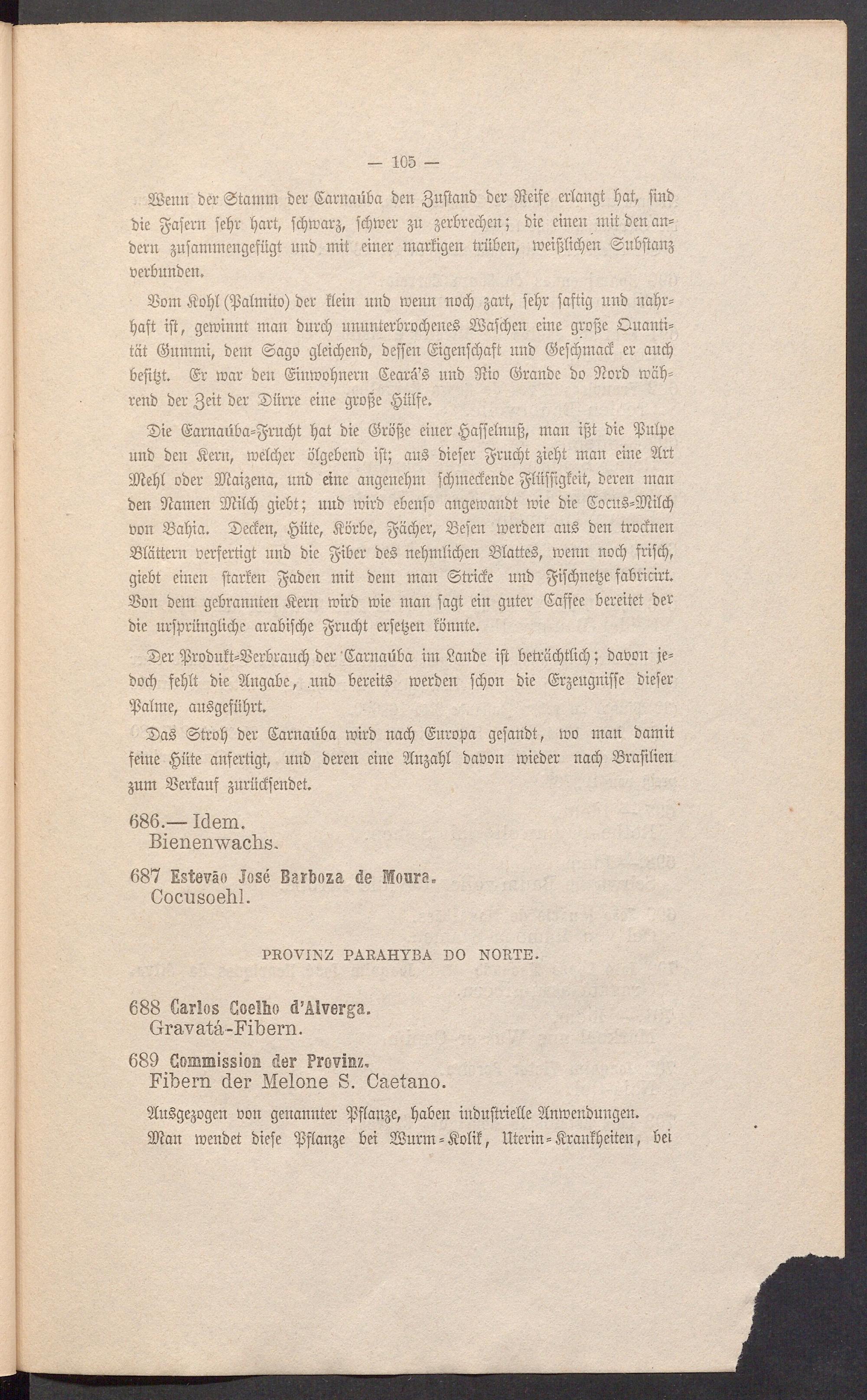 ©er ißrobutt=S5erbraud) ber 'Karnaüba im Sanbe ift beWctdjtlid; ; baüon je* bod) fetdt bie Angabe, .unb bereite Werben fdfon bie Krgeugniffe biefer ißatme, au§gefüt)rt.