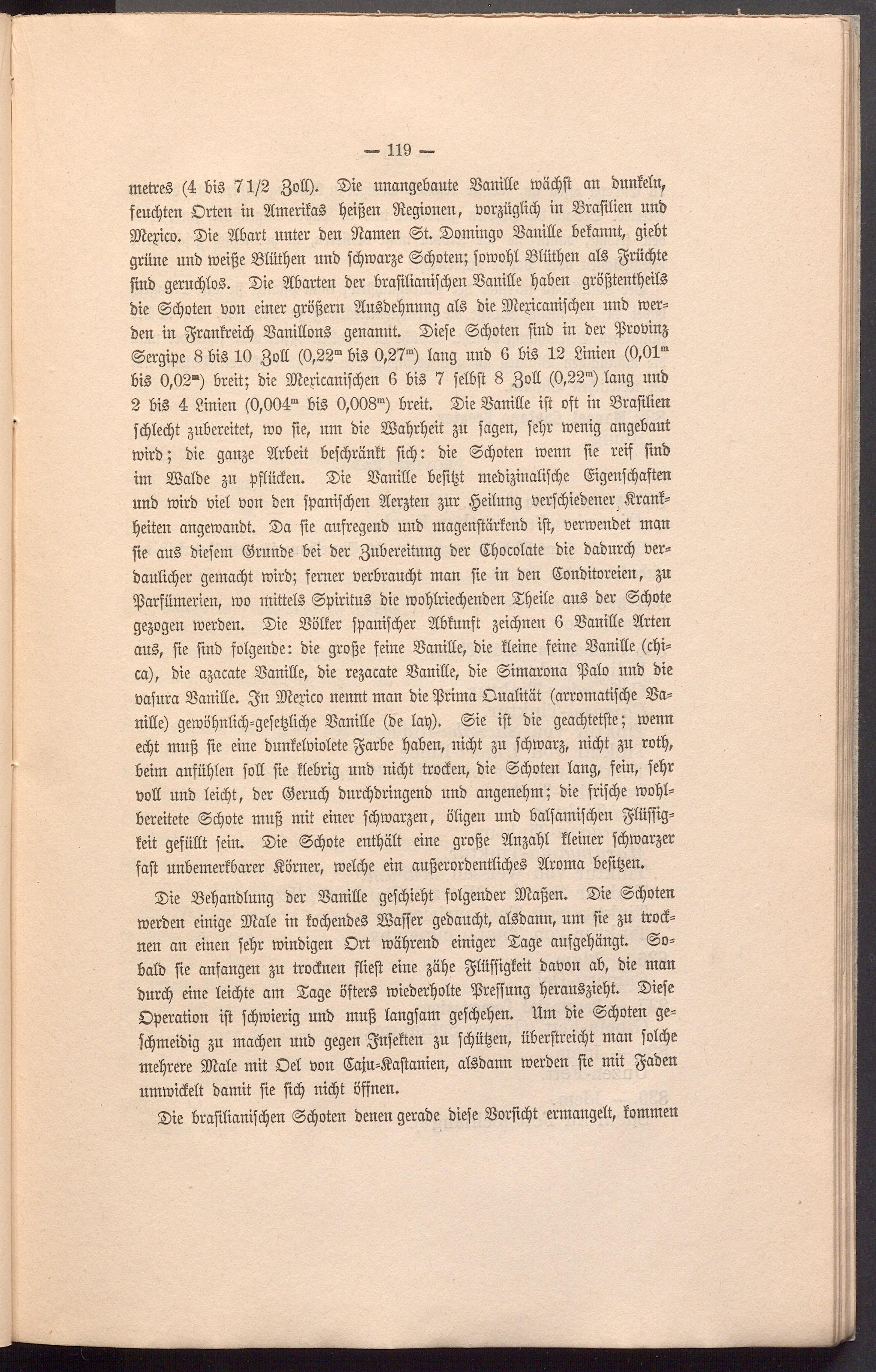 rnetreS (4 bis 71/2 3°^)- mtangebaute Sßanitle wadfft an bunfeln, feuchten Orten in SlmerifaS peiffert Legionen, üorgitglicp in SSrafiüen nnb SDtepico. Oie Slbart unter ben kanten ©t. Oomingo SJanitte befannt, gießt grüne nnb toei^e Stützen nnb fdjwarge ©dfotert; fowopl Stützen als 'Jritc^te ftnb gerucploS. Oie Abarten ber brafilianifcpen SSaititte traben gröfjtentpeilS bie ©d)oten üon einer gröpern ÜluSbcpnung als bie SDtepicanifcpen nnb wer= ben in ^ranfreicp SSantllonS genannt Oiefe ©cpoten ftnb itt ber tßroüing ©ergipe 8 bis 10 3 off (0,22 m bis 0,27 m ) lang itub 6 bis 12 Sinien (0,01 m biä 0,02“) breit; bie ifftericattifcpen 6 bis 7 felbff 8 3°ff (0,22 m ) taug nnb 2 bi§ 4 Sintert (0,004 m bis 0,008 ra ) breit. Oie SSaniffe ift oft in SBrafitien fdflecpt 3 über eitet, wo fte, um bie SSaprpeit gu fagen, fefjr wenig angebant wirb; bie gange Arbeit befcpranft fid): bie ©djoten wenn fie reif ftnb im SBalbe gu tpffücfen. Oie SBaniffe befiljt mebigiualifcpe (Hgenfdpaften nnb wirb üiel üon ben fpanifdjcn Sfagten gur Reifung uerf epiebener tranß feiten angewanbt. Oa fte aufregenb mtb magenftarfenb ift, üerwenbet man fte aus biefem ©runbe bei ber 3 uberettmtg ber ©pocolate bie baburd) üer= baulicher gemalt wirb; ferner üerbraucpt man fie in ben ©onbitoreien, gu tßarfümerien, Wo mittels ©pirituS bie woplriedfenben Op eile auS ber ©cpote gezogen werben. Oie SBötfer fpattifdjer Ibfunft geicpnen 6 Sßaniffe Sitten auS, fte ftnb fotgenbe: bie grope feine SBaniffe, bie Heine feine Sandle (cpd ca), bie agacate Sandle, bie regacate Sandle, bie ©imarona tpalo nnb bie Oafrtra Saniffe. 3« ffftepico nennt man bie ißrinta Ouafttät (arromatifdpe Sa- niffe) gewöpnlid)=gefefdid)e SSanitte (be tap). ©ie ift bie geadptetfte; wenn ed)t muff fie eine bunfelüiolete $arbe pabett, uid)t gu fdfwarg, nicpt gu rotp, beim anfüplen foff fie fiebrig nnb nicpt troden, bie ©cpoten lang, fein, fept üoff nnb leidft, ber ©erucp burcpbringenb mtb angenehm; bie frifd)e wopl= bereitete ©d)ote rnufj mit einer fcpwargen, öligen nnb balfamifcpen glüffig* feit gefüllt fein. Oie ©dfote enthalt eine grofje Slngapl Heiner fcpwarger faft unbemerfbarer Körner, welche etn aufferorbentlicpeS Stroma beftpert.