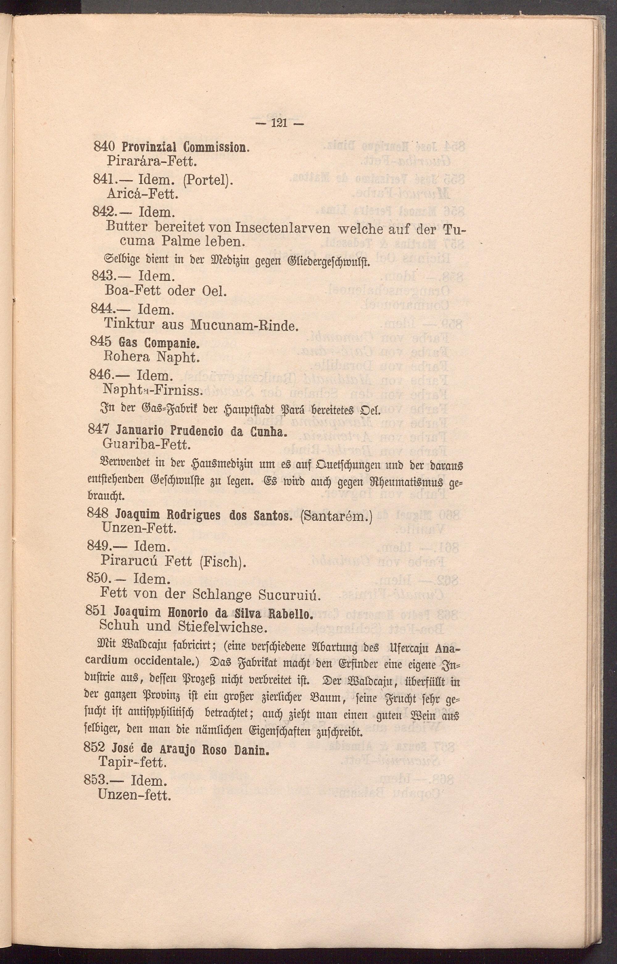 3Mit Salbcaju fabricirt; (eine berfcljiebene Slbartung bet Ufercaju Ana- cardium occidentale.) Dat $abrifat madjt ben (Srfinber eine eigene $n= bujtrie aut, beffen ißrogefs nidjt Verbreitet ift. Der 2Balbcaj.it , überfüllt in ber gangen ^robing ift ein grofjer gierlidjer 23aum, feine $rud)t fepr ge= flicht ift antifppbtlitifcf) betrautet; and) gtefü man einen guten Sein aut felbiger, ben man bie nämlidjen (Sigenfdjaften gufdjreibt.