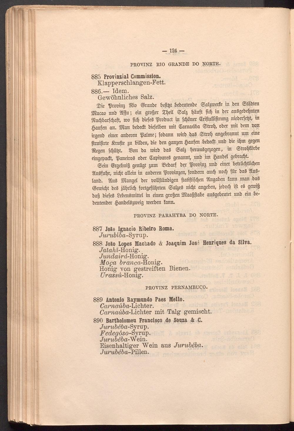 Sie tßrobinä 9iio ©ranbe beftfjt bebeutenbe ©admette itt ben ©tabten Sftacao nnb üffu ; ein grojjer Sfyeit ©atj ïjâitft ftcf) in ber au§gebetjnten SRadbbarfdjaft, mo fief) biefeê ißrobuct in fdjöner Sriftattiftrung nieberfefd, in Raufen an. 3Jian bebedt biefelben mit (Sarnaüba ©trofy, über mit bem bon irgenb einer anberen ißatme; fob amt mirb ba§ ©trot) angebrannt nm eine firnifirte Trufte gu hüben, bie ben gangen Raufen bebedt nnb bie tfjrn gegen liegen fdjüfrt. Sort ba mirb ba§ ©atg tjerau§gegogen, in ©troljförbe eingepadt, 9ßaneiro§ ober EapioareS genannt, nnb im § anbet gebraut.