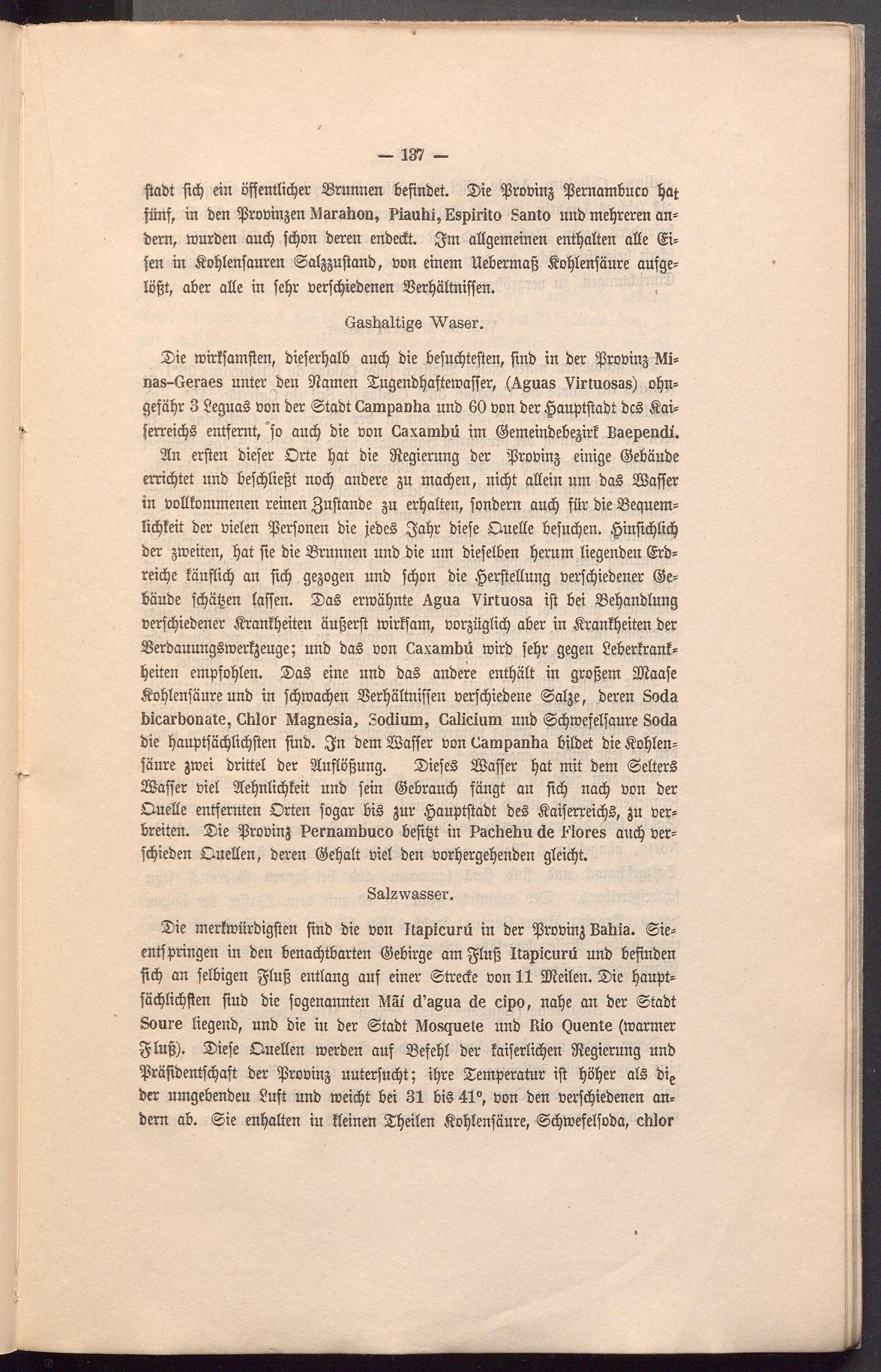 Oie merkmiirbigften ftnb bie toon Itapicurü in ber kßroütn^ Bahia. Sie* entfpringen in ben benachbarten ©ebirge am ^litfj Itapicurü unb befinben ftch an felbigen glufj entlang auf einer ©trecke üon 11 teilen. Oie haupt* fädhlidhflen ftnb bie fogenannten Mal d’agua de cipo, nahe an ber ©tabt Soure liegenb, nnb bie in ber ©tabt Mosquete unb Piio Quente (marmer 3lufj), Oiefe Duellen merben auf ^Befehl ber kaiferlidhen ^Regierung unb kßräftbentfdhaft ber kßroüin§ uuterfucht; ihre Oemperatur ift h^h er al§ bi e ber nmgebenbeu Snft unb meidht bei 31 bi§ 41°, toon ben toerfcpiebenen am bem ab. @ie enhalten in kleinen Oh eilen Kohlenfäure, ©dhmefelfoba, chlor