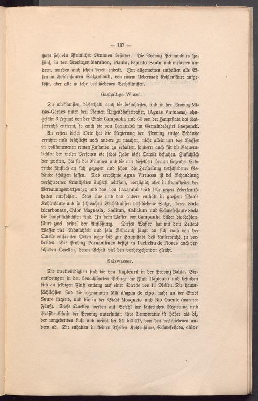 3In erften biefer Orte hat bie Regierung ber ißrotoinj einige ©ebäube errichtet unb befchliept nod) anbere ju machen, nicht allein um bas SBaffer in toollfommenen reinen guftanbe §u erhalten, fonbern audh für bie Sequent* lichfeit ber tiielen kßerfonen bie jebeS 3 a h r biefe Duelle befuchen. §infid)lich ber jmeiten, hat fte bie Srunnen unb bie um biefelben herum liegenben ©rb= reiche käuflich an ftch gezogen unb fchon bie ^erfteHung toerfdhiebener @e* bäube fd; alien laffen. Dag ermähnte Agua Virtuosa ift bei Sehanblung toerfdhiebener Krankheiten äufserft mirffam, toorgüglid; aber in Krankheiten ber Serbauungsmerkjeuge; unb baS üon Caxambü mirb fehr gegen leberkrank* heiten empfohlen. Da§ eine unb ba§ anbere enthält in großem 2Raafe Kohlenfäure unb in fchmadhen Serhältniffeit toerfdhiebene ©alje, beren Soda bicarbonate, Chlor Magnesia, Sodium, Calicium unb ©dhmefelfaure Soda bie hauptfädhlichften ftnb. 3u bemSSaffer toon Campanha bilbet bie Kohlen* fäure gmei brittet ber Sluflöpung. Dtejeg Saffer h fl t mit bem ©elterS SBaffer toiel 2lehnlid)keit unb fein ©ebraudh fängt an ftch nach öon tier Duelle entfernten Orten fogar bis? jur fpauptftabt be§ KaiferreidjS, ju üer* breiten. Oie ißrotoinj Pernambuco befiel in Pachehu de Flores auch üer* fdhieben Duellen, beren ©efialt toiel ben toorhergehenben gleicht.