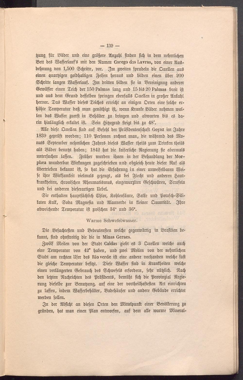 Sitte biefe Ouetten ftnb auf Sefept ber ißräfibentenfcpaft Goyaz im $apre 1839 geprüft morben; 110 ißerfonen regnet man, bie mäprenb beg 9Jlo= natg September nepmticpen $apreg biefeg Staffer tpcitg gum Trinten tpeitg atg Säber benutjt p ab eit; 1842 pat bie faiferticpe Regierung fte abermatg unterfucpen taffen, gritper mürben iptten in ber Sepanbtung ber Morphea munberbar Stirfungeu jugefcprieben unb obgteicp peute biefer 9tuf atg übertrieben befannt ift, fo pat bie Gsrfaprnng in einer unmeifetbaren Stei= fe ipre Stirffamfeit üietmatg gezeugt, atg bei $tecpt unb anberen §auH franfßeiten, cproniftpen fftpeumatigmng, eingemurjften ©efcpmüren, Scrofetn unb bei anberen bieferartigen Hebet.