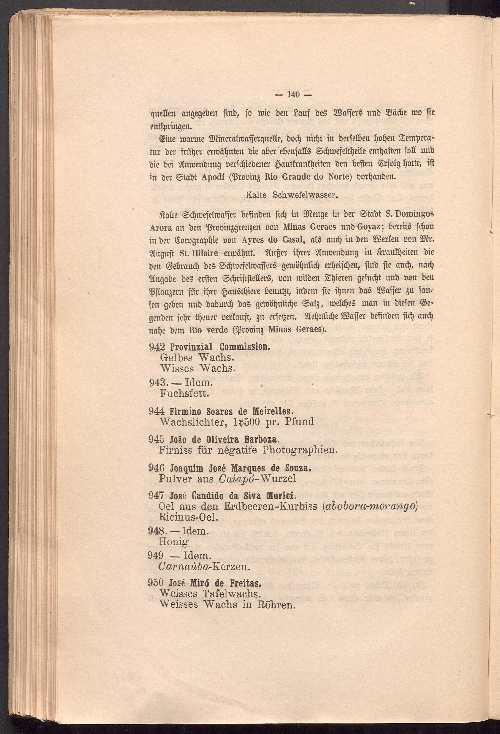 Äafte ©djwefelwaffer befiuben fi<h in Stenge in ber ©tabt S. Domingos Arora an ben ißroüinjgrenjen bon Minas Geraes unb Goyaz; bereits fchon in ber (Sorographü non Ayres do Casai, als auch * n ben SBerfen non 2Jir. Sluguft St. Hilaire erwähnt. 2tufier ihrer Slnwenbung in Ärantheiten bie ben (Gebrauch beS ©cpwefelwafferä gewöhnlich erheifcïjen, ftnb fie auch, nach Angabe be§ erften ©chriftftefterS, bon wilben gieren gefutht unb bon ben ißflanjern für ihre ^auSthiere benutzt, inbent fte ihnen ba§ Saffer ju fan* fen geben unb baburcp baS gewöhnliche ©a(j, welches ntan in biefen 05e= genben feljr theuer öerfauft, ju erfeijen. Sehnliche Suffer befiuben fich auch nahe bent Rio verde ößrobinj Minas Geraes).