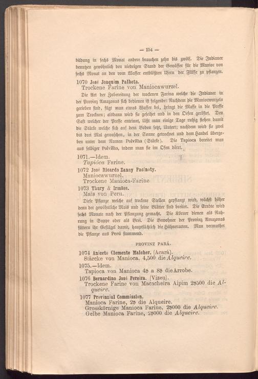 Die SCrt ber Zubereitung ber trodenen farina meldfe bie Znbianer in ber ipromttg StnagonaS fid) bebten en ift folgenbe: 9cad)bem bie SOianiocmurgeln gerieben finb, fügt man etmaS Staffer bei, bringt bie SJtaffe in bie greffe gum Drodnen; aisbann mirb fte gefeilt unb in ben Defen geröftet. Den Daft melcfyer ber greffe entrinnt, laßt man einige Sage rul)ig fielen bamit bie ©tarie mettle fid) auf bem Soben fcijt, läutert; nadfbem mirb fie gmei bi§ brei SJtat gemafdfen, in ber Donne getrodnet unb bem $anbel übergeben unter bem dtamen Polvilha ( ©tarie ). Die Tapioca bereitet man auS felbiger Polvilha, inbem man fie im Ofen hont _