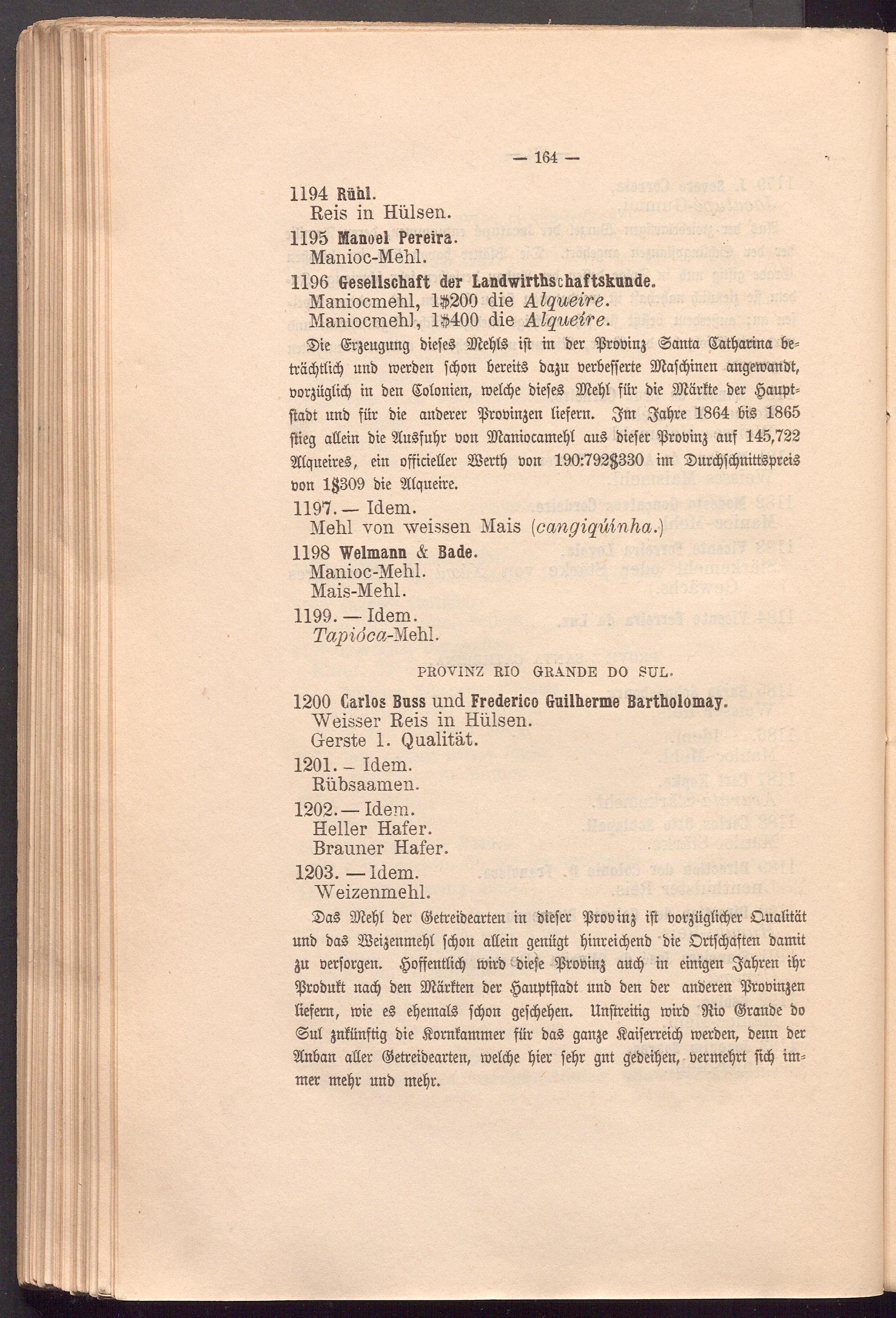 Sie ©rjeugung biefeS SDlehB ift in ber ißrooinj (Santa ©athatina be= träd)t(id) unb werben fcfwn bereits baju öerbefferte ßftafchinen angewanbt, oorjüglich in ben (Solottien, welche biefeS 3Jte^t für bie üJiärfte ber .§auf)t= ftabt unb für bie anberer ißroüingen liefern. 1864 bis 1865