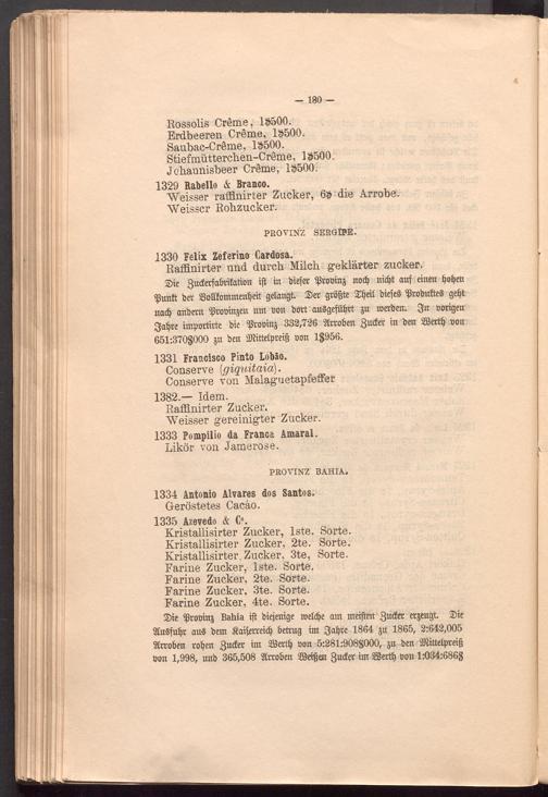 Sie ißrobinj Bahia ift biejenige toeldje ant nteiften 3ndcr erjeugt. Sie 21u§fnßr au§ bent Äaijjerreicß betrug im 3nßrs 1864 ju 1865, 2:642,005 Slrroben roßen 3 UC ^ im SBertß bon 5:281:9088000, ju ben 9KtttetpreiR bon 1,998, unb 365,508 Slrroben Seiten 3ucfer im SBertß bon 1:034:686$