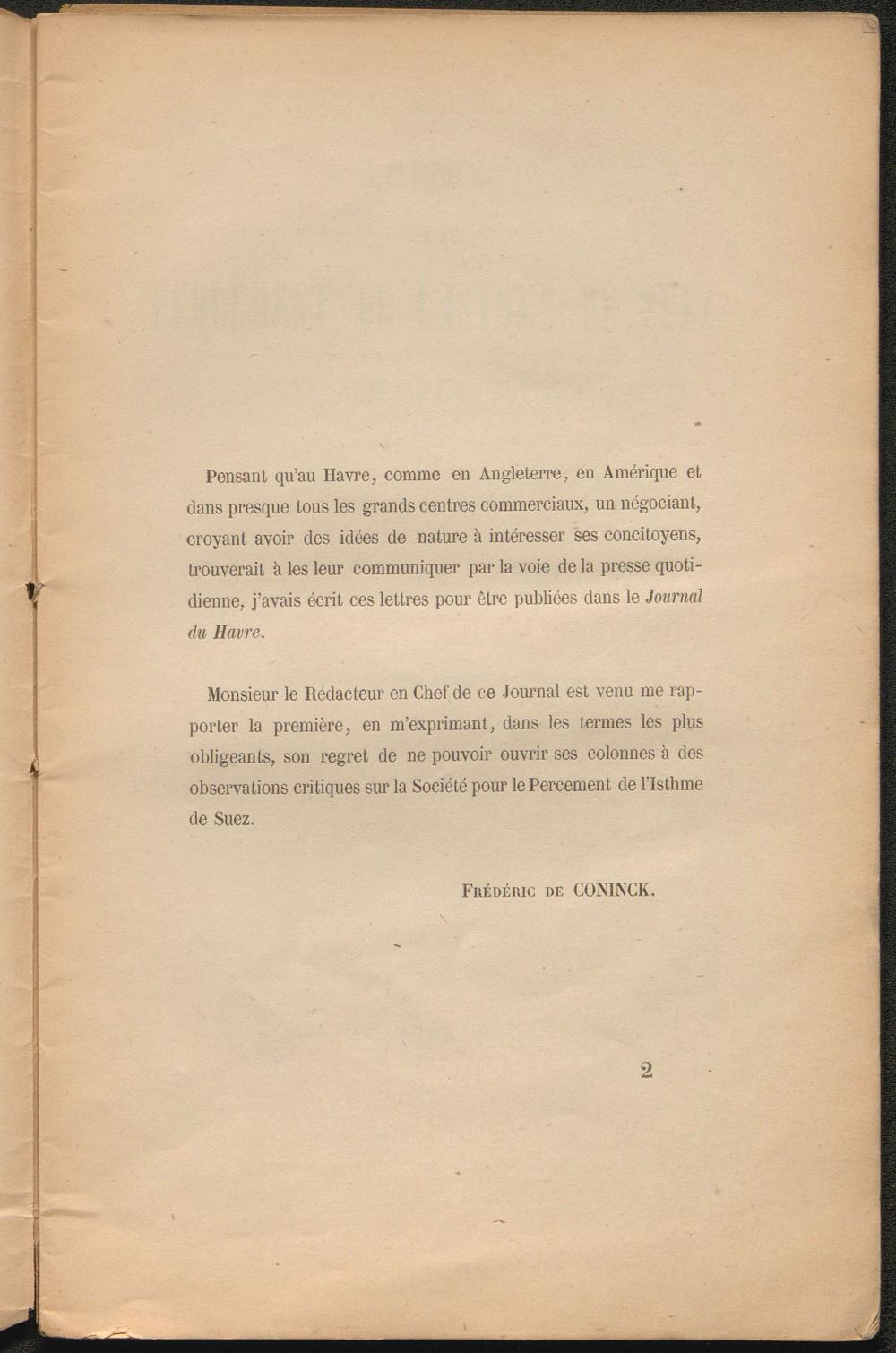 Pensant qu’au Havre, comme en Angleterre, en Amérique et dans presque tous les grands centres commerciaux, un négociant, croyant avoir des idées de nature à intéresser ses concitoyens, trouverait à les leur communiquer par la voie de la presse quotidienne, j’avais écrit ces lettres pour être publiées dans le Journal du Havre.