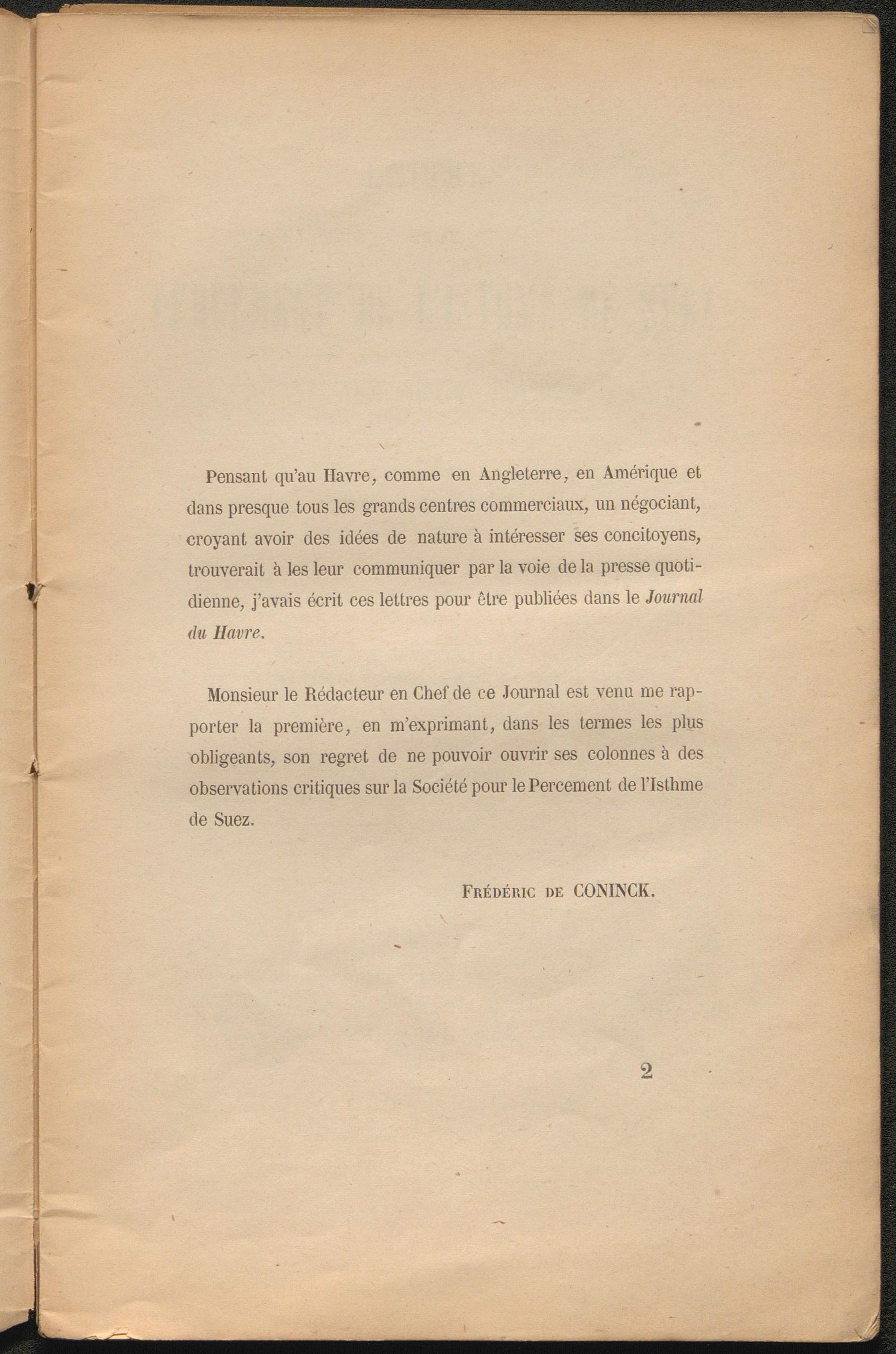 Monsieur le Rédacteur en Chef de ce Journal est venu me rapporter la première, en m’exprimant, dans les termes les plus obligeants, son regret de ne pouvoir ouvrir ses colonnes à des observations critiques sur la Société pour le Percement de l’Isthme de Suez.