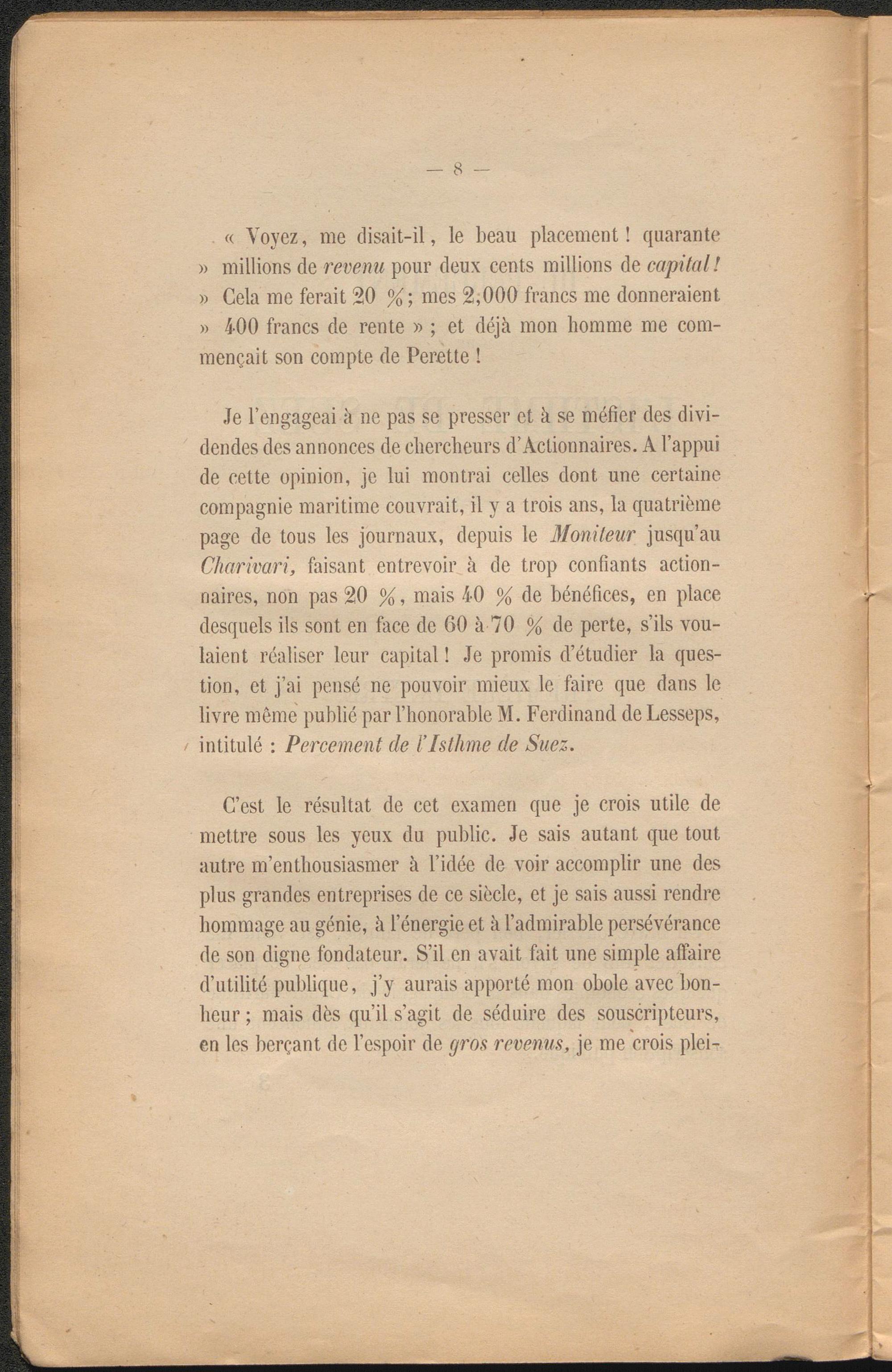 Je l’engageai à ne pas se presser et à se méfier des dividendes des annonces de chercheurs d’Actionnaires. A l’appui de cette opinion, je lui montrai celles dont une certaine compagnie maritime couvrait, il y a trois ans, la quatrième page de tous les journaux, depuis le Moniteur jusqu’au Charivari, faisant entrevoir à de trop confiants actionnaires, non pas 20 % , mais 40 % de bénéfices, en place desquels ils sont en face de 60 à 70 % de perte, s’ils voulaient réaliser leur capital ! Je promis d’étudier la question, et j’ai pensé ne pouvoir mieux le faire que dans le livre même publié par l’honorable M. Ferdinand de Lesseps, intitulé : Percement de l’Isthme de Suez.