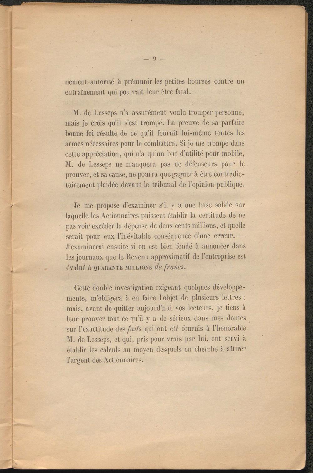 M. de Lesseps n’a assurément voulu tromper personne, mais je crois qu’il s’est trompé. La preuve de sa parfaite bonne foi résulte de ce qu’il fournit lui-même toutes les armes nécessaires pour le combattre. Si je me trompe dans cette appréciation, qui n’a qu’un but d’utilité pour mobile, M. de Lesseps ne manquera pas de défenseurs pour le prouver, et sa cause, ne pourra que gagner à être contradictoirement plaidée devant le tribunal de l’opinion publique.