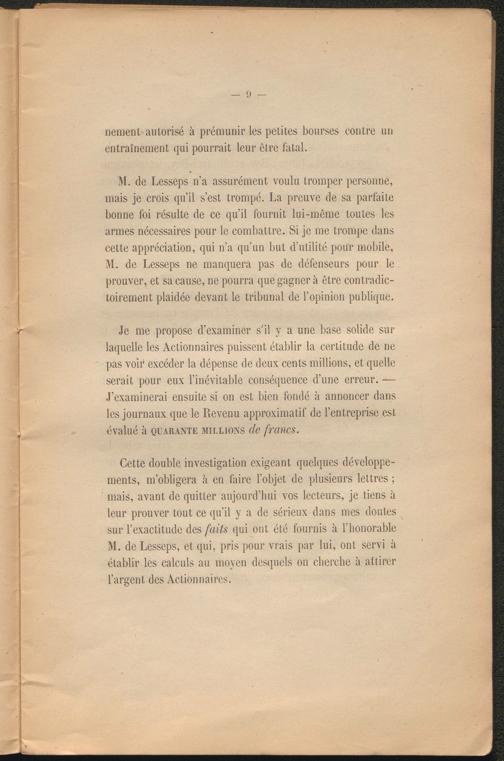 Je me propose d’examiner s’il y a une base solide sur laquelle les Actionnaires puissent établir la certitude de ne pas voir excéder la dépense de deux cents millions, et quelle serait pour eux l’inévitable conséquence d’une erreur. — J’examinerai ensuite si on est bien fondé à annoncer dans les journaux que le Revenu approximatif de l’entreprise est évalué à quarante millions de francs.