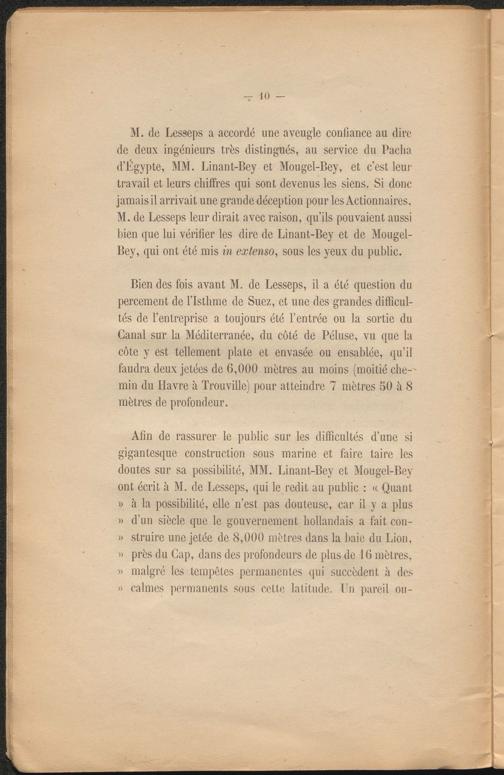 M. de Lesseps a accordé une aveugle confiance au dire de deux ingénieurs très distingués, au service du Pacha d’Égypte, MM. Linant-Bey et Mougel-Bey, et c’est leur travail et leurs chiffres qui sont devenus les siens. Si donc jamais il arrivait une grande déception pour les Actionnaires, M. de Lesseps leur dirait avec raison, qu’ils pouvaient aussi bien que lui vérifier les dire de Linant-Bey et de Mougel- Bey, qui ont été mis in extenso, sous les yeux du public.