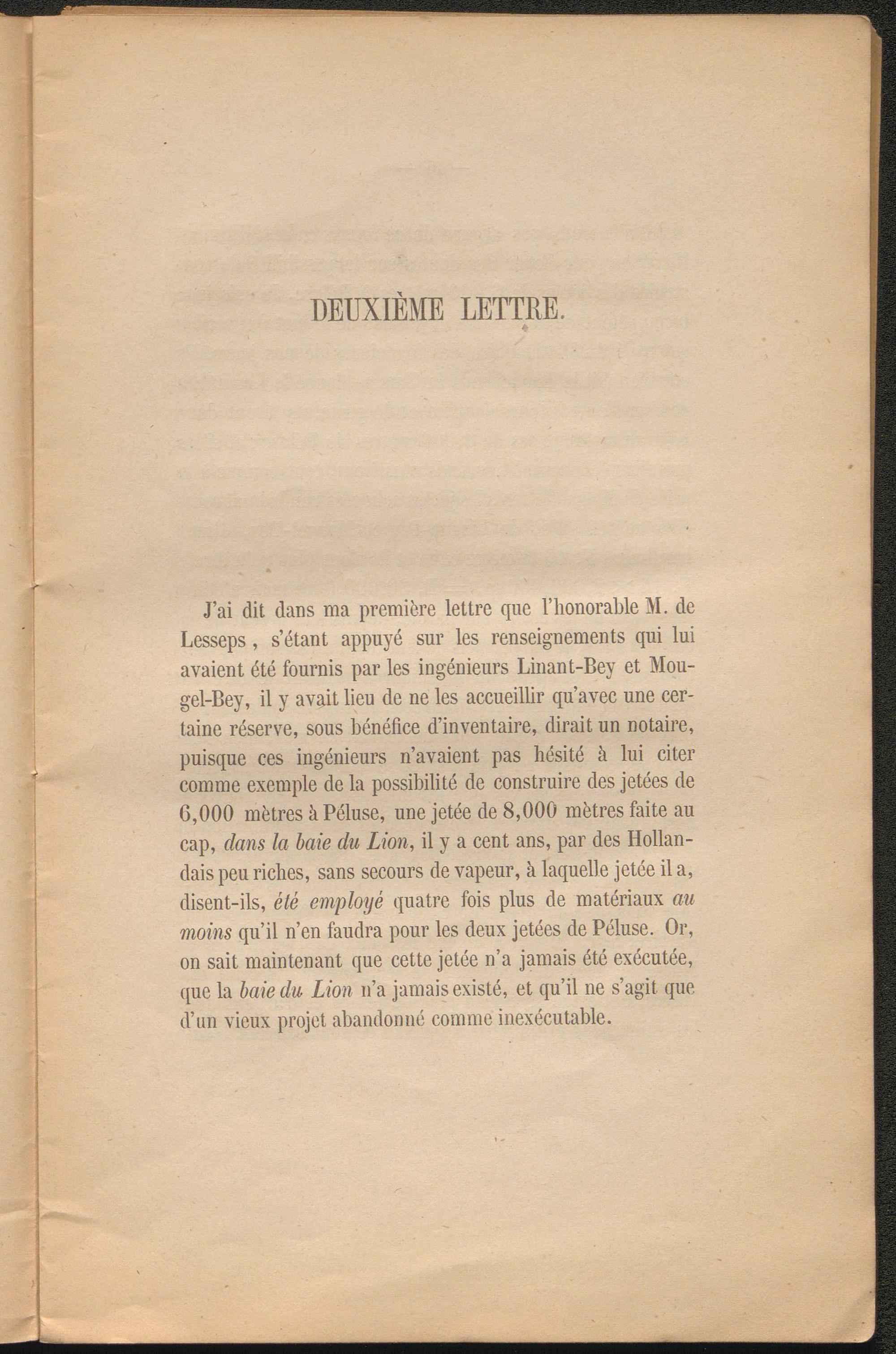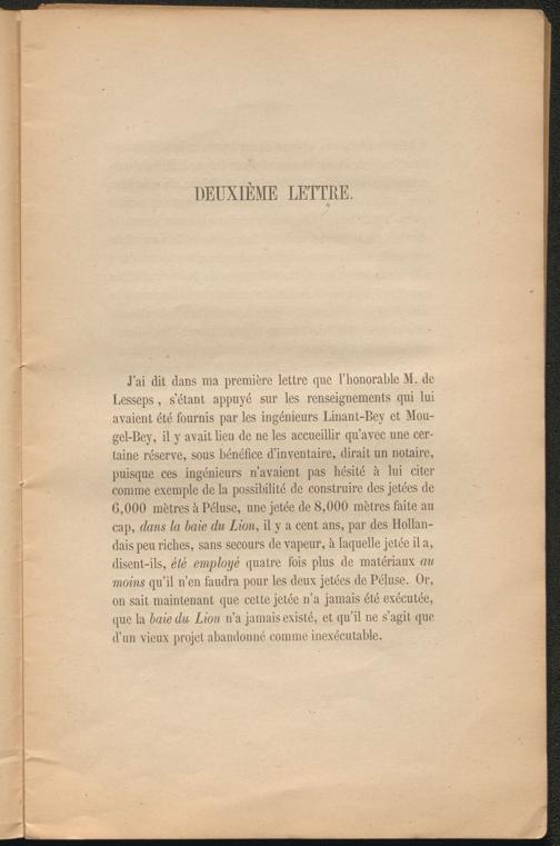 J’ai dit dans ma première lettre que l’honorable M. de Lesseps, s’étant appuyé sur les renseignements qui lui avaient été fournis par les ingénieurs Linant-Bey et Mou- gel-Bey, il y avait lieu de ne les accueillir qu’avec une certaine réserve, sous bénéfice d’inventaire, dirait un notaire, puisque ces ingénieurs n’avaient pas hésité à lui citer comme exemple de la possibilité de construire des jetées de G,000 mètres à Péluse, une jetée de 8,000 mètres faite au cap, dans la baie du Lion , il y a cent ans, par des Hollandais peu riches, sans secours de vapeur, à laquelle jetée il a, disent-ils, été employé quatre fois plus de matériaux au moins qu’il n’en faudra pour les deux jetées de Péluse. Or, on sait maintenant que cette jetée n’a jamais été exécutée, que la baie du Lion n’a jamais existé, et qu’il ne s’agit que d’un vieux projet abandonné comme inexécutable.