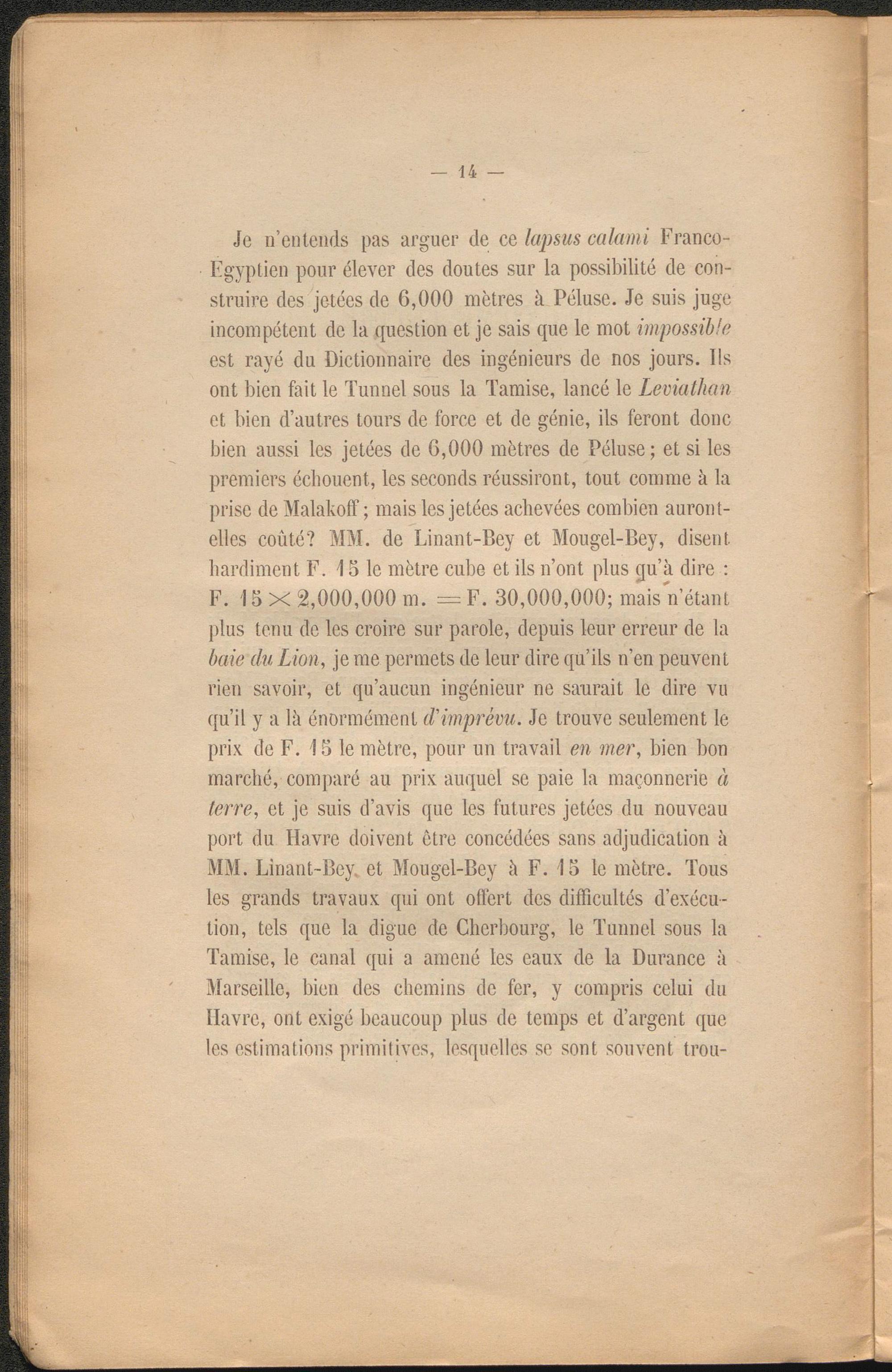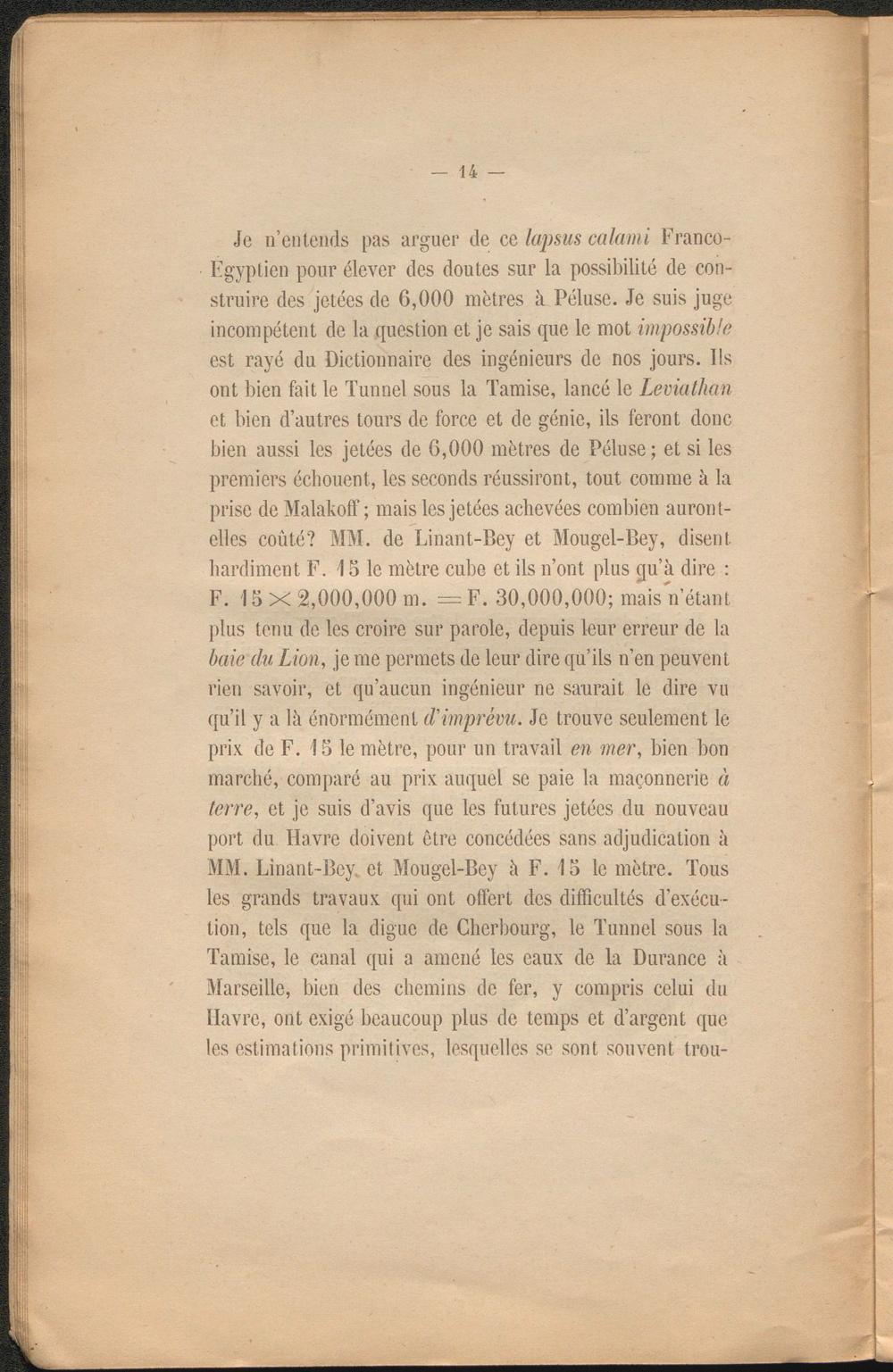 Je n’entends pas arguer de ce lapsus calami Franco- Egyptien pour élever des doutes sur la possibilité de construire des jetées de 6,000 mètres à Péluse. Je suis juge incompétent de la question et je sais que le mot impossible est rayé du Dictionnaire des ingénieurs de nos jours. Ils ont bien fait le Tunnel sous la Tamise, lancé le Leviathan et bien d’autres tours de force et de génie, ils feront donc bien aussi les jetées de 6,000 mètres de Péluse ; et si les premiers échouent, les seconds réussiront, tout comme à la prise de Malakoff ; mais les jetées achevées combien auront- elles coûté? MM. de Linant-Bey et Mougel-Bey, disent hardiment F. 15 le mètre cube et ils n’ont plus qu’à dire : F. 15 X 2,000,000 m. = F. 30,000,000; mais n’étant plus tenu de les croire sur parole, depuis leur erreur de la baie du Lion, je me permets de leur dire qu’ils n’en peuvent rien savoir, et qu’aucun ingénieur ne saurait le dire vu qu’il y a là énormément d'imprévu. Je trouve seulement le prix de F. 15 le mètre, pour un travail en mer, bien bon marché, comparé au prix auquel se paie la maçonnerie à terre, et je suis d’avis que les futures jetées du nouveau port du Havre doivent être concédées sans adjudication à MM. Linant-Bey. et Mougel-Bey à F. 15 le mètre. Tous les grands travaux qui ont offert des difficultés d’exécution, tels que la digue de Cherbourg, le Tunnel sous la Tamise, le canal qui a amené les eaux de la Durance à Marseille, bien des chemins de fer, y compris celui du Havre, ont exigé beaucoup plus de temps et d’argent que les estimations primitives, lesquelles se sont souvent trou-