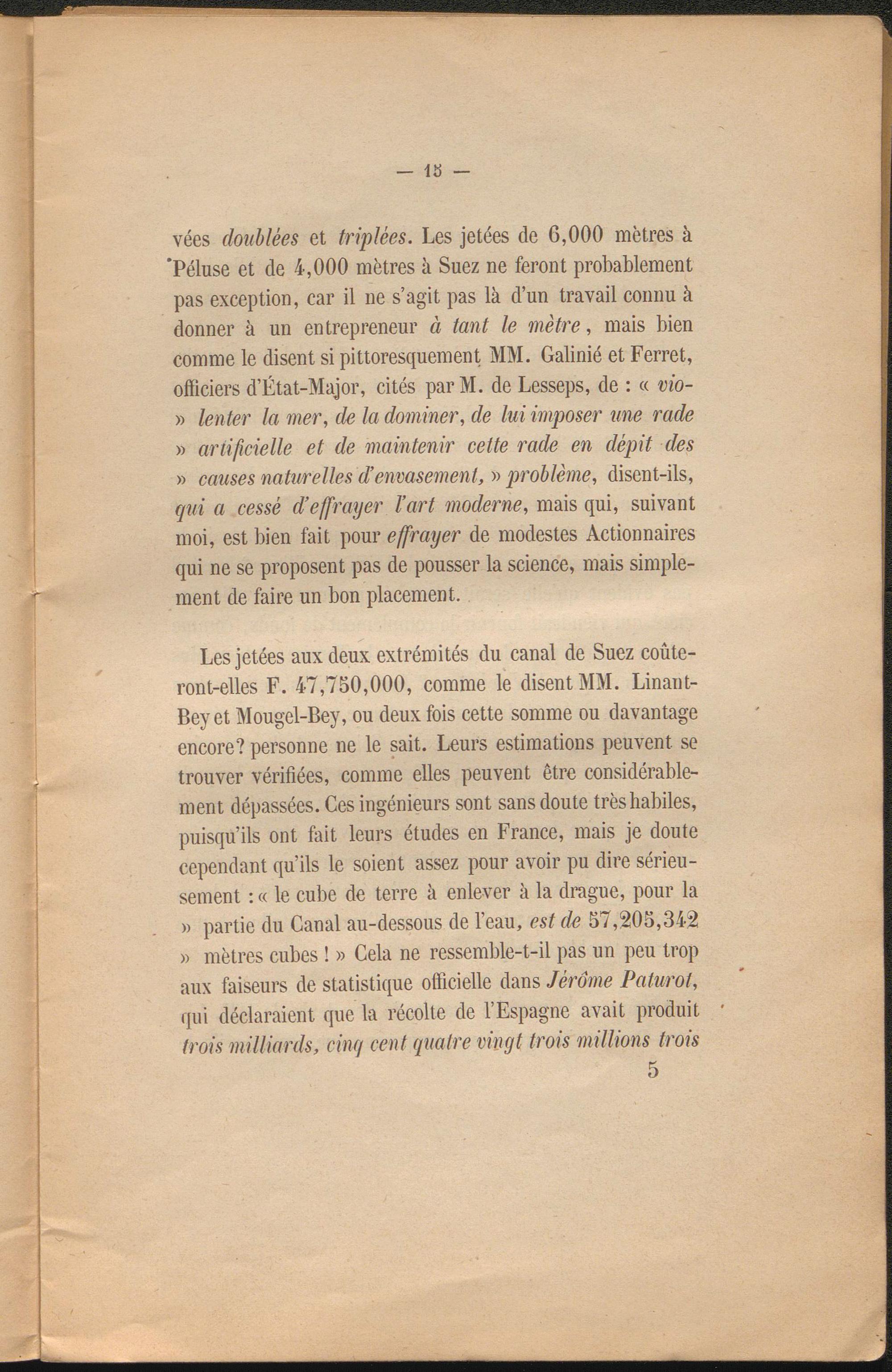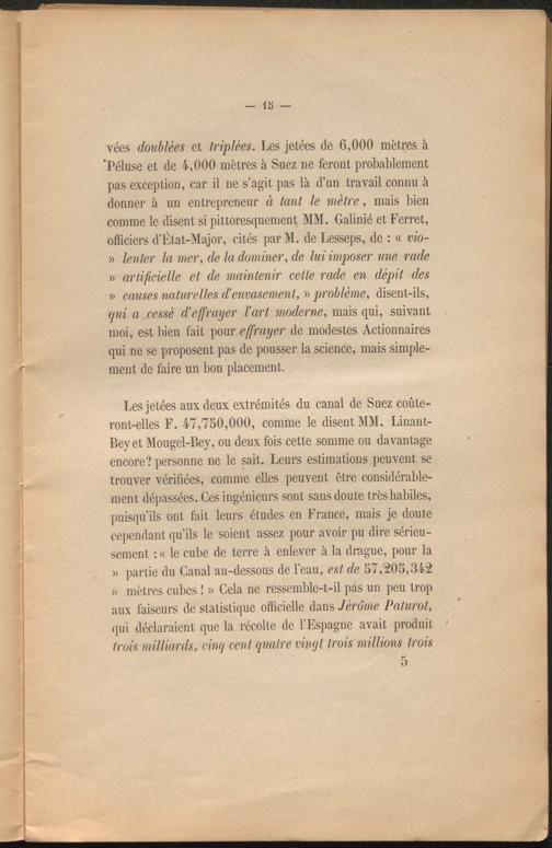 Les jetées aux deux extrémités du canal de Suez coûteront-elles F. 47,750,000, comme le disent MM. Linant- Bey et Mougel-Bey, ou deux fois cette somme ou davantage encore? personne ne le sait. Leurs estimations peuvent se trouver vérifiées, comme elles peuvent être considérablement dépassées. Ces ingénieurs sont sans doute très habiles, puisqu’ils ont fait leurs études en France, mais je doute cependant qu’ils le soient assez pour avoir pu dire sérieusement : « le cube de terre à enlever à la drague, pour la » partie du Canal au-dessous de l’eau, est de 57,205,342 » mètres cubes ! » Cela ne ressemble-t-il pas un peu trop aux faiseurs de statistique officielle dans Jérome Paturot, qui déclaraient que la récolte de l’Espagne avait produit trois milliards, cinq cent quatre vingt trois millions trois
