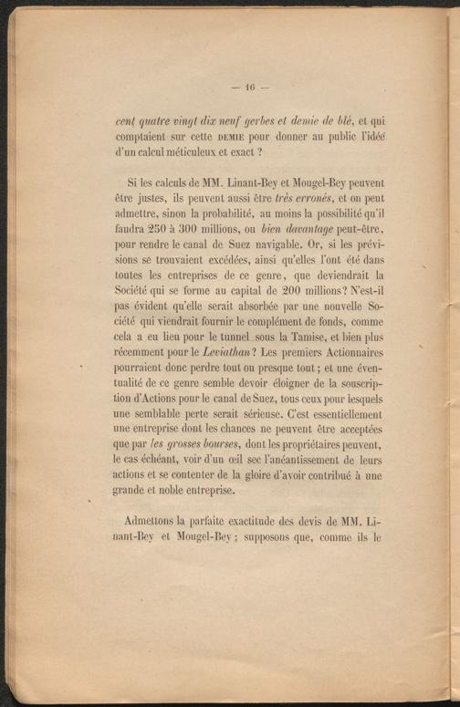 Si les calculs de MM. Linant-Bey et Mougel-Bey peuvent être justes, ils peuvent aussi être très erronés, et on peut admettre, sinon la probabilité, au moins la possibilité qu’il faudra 250 à 300 millions, ou bien davantage peut-être, pour rendre le canal de Suez navigable. Or, si les prévisions se trouvaient excédées, ainsi quelles l’ont été dans toutes les entreprises de ce genre, que deviendrait la Société qui se forme au capital de 200 millions? N’est-il pas évident quelle serait absorbée par une nouvelle Société qui viendrait fournir le complément de fonds, comme cela a eu lieu pour le tunnel sous la Tamise, et bien plus récemment pour le Leviathan ? Les premiers Actionnaires pourraient donc perdre tout ou presque tout ; et une éventualité de ce genre semble devoir éloigner de la souscription d’Actions pour le canal de Suez, tous ceux pour lesquels une semblable perte serait sérieuse. C’est essentiellement une entreprise dont les chances ne peuvent être acceptées que par les grosses bourses, dont les propriétaires peuvent, le cas échéant, voir d’un œil sec l’anéantissement de leurs actions et se contenter de la gloire d’avoir contribué à une grande et noble entreprise.