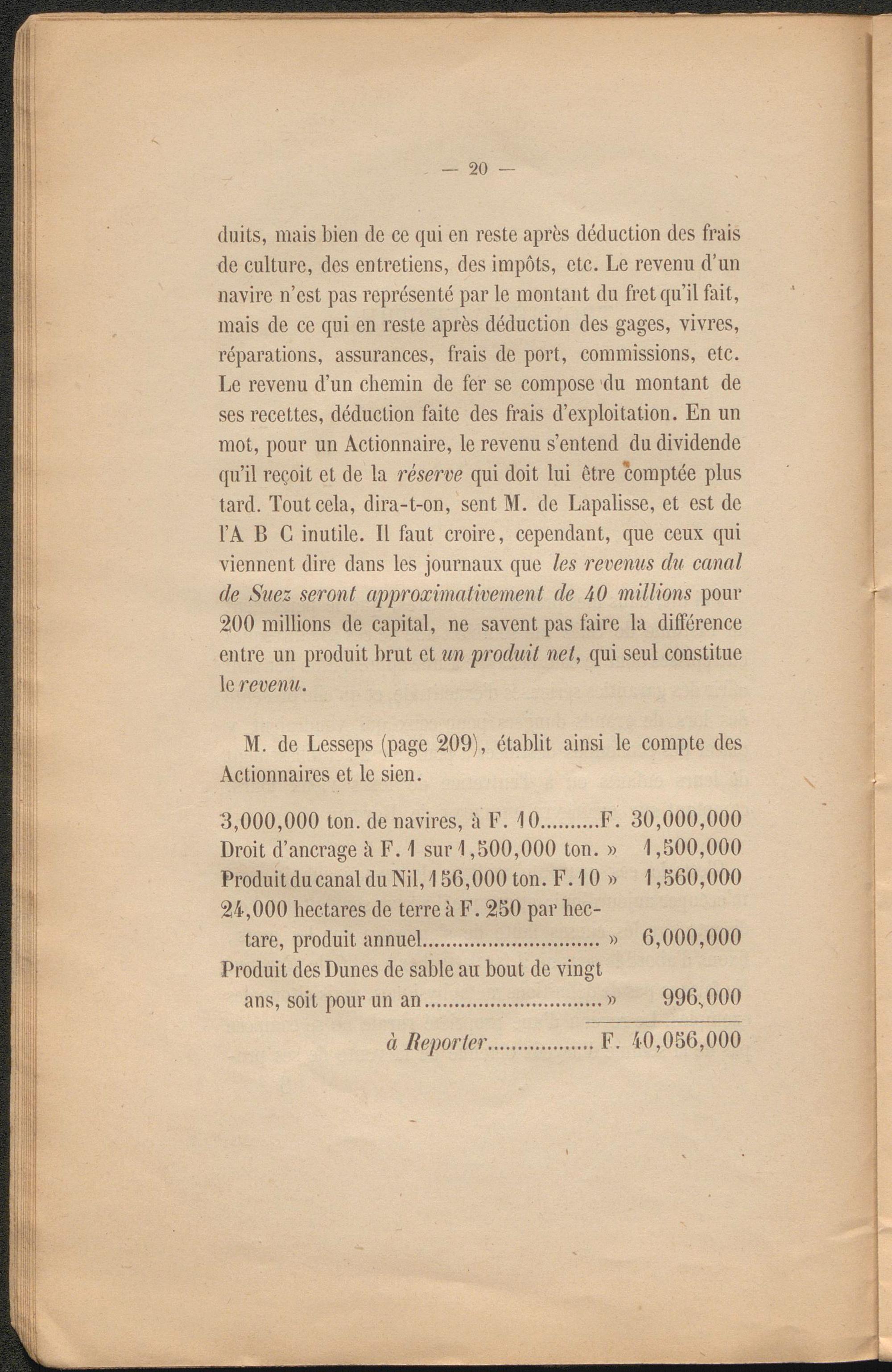 duits, mais bien de ce qui en reste après déduction des frais de culture, des entretiens, des impôts, etc. Le revenu d’un navire n’est pas représenté par le montant du fret qu’il fait, mais de ce qui en reste après déduction des gages, vivres, réparations, assurances, frais de port, commissions, etc. Le revenu d’un chemin de fer se compose du montant de ses recettes, déduction faite des frais d’exploitation. En un mot, pour un Actionnaire, le revenu s’entend du dividende qu’il reçoit et de la réserve qui doit lui être comptée plus tard. Tout cela, dira-t-on, sent M. de Lapalisse, et est de VA B C inutile. Il faut croire, cependant, que ceux qui viennent dire dans les journaux que les revenus du canal de Suez seront approximativement de 40 millions pour 200 millions de capital, ne savent pas faire la différence entre un produit brut et un produit net, qui seul constitue le revenu.