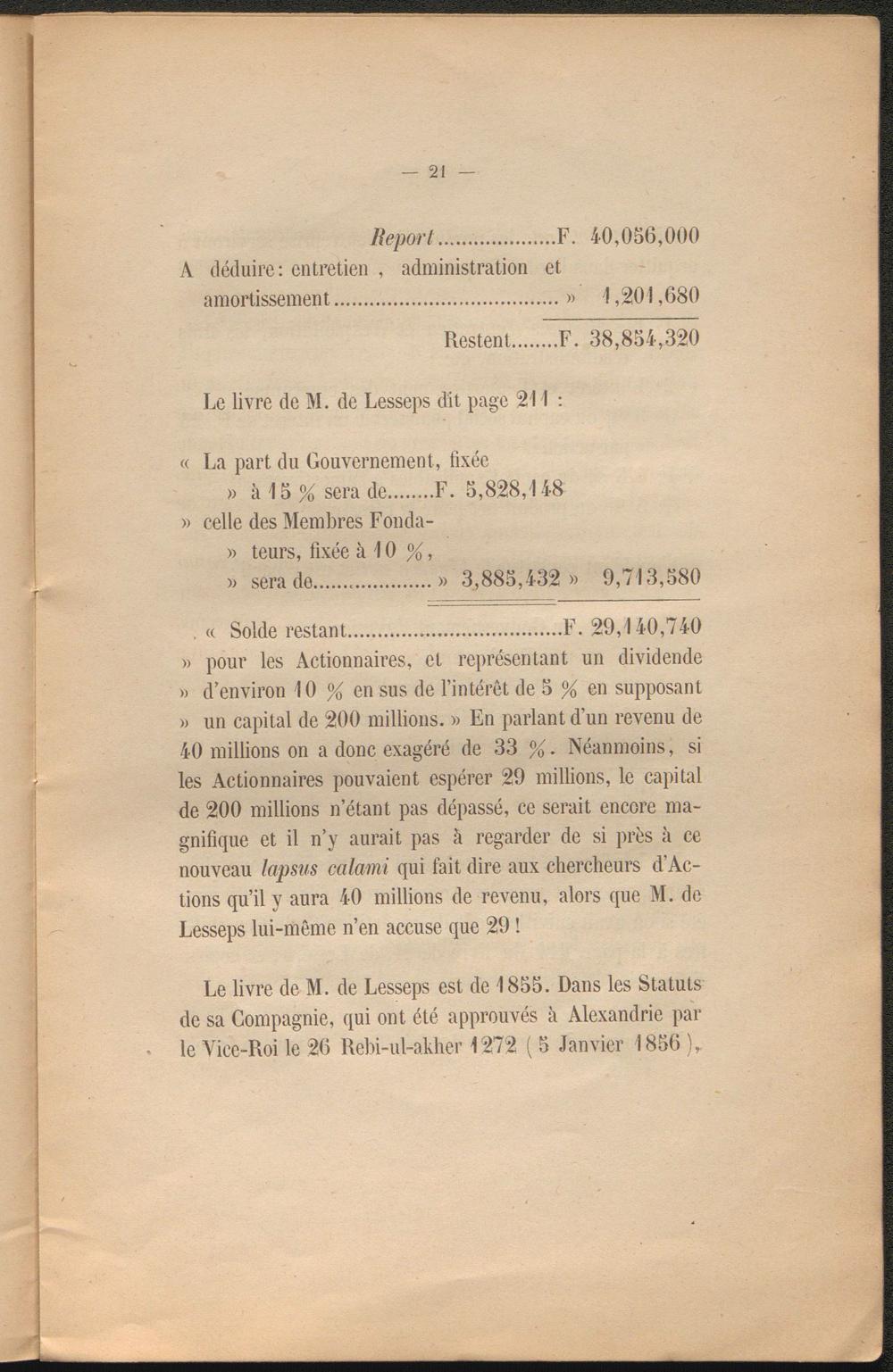 Le livre de M. de Lesseps est de 1855. Dans les Statuts de sa Compagnie, qui ont été approuvés à Alexandrie par le Vice-Roi le 26 Rebi-ul-akher 1272 ( 5 Janvier 1856 ) r