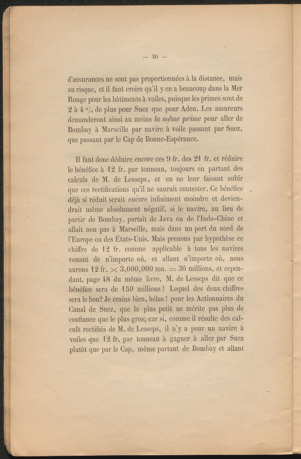 Il faut donc déduire encore ces 9 fr. des 21 fr. et réduire le bénéfice à 12 fr. par tonneau, toujours en partant des calculs de M. de Lesseps, et en ne leur faisant subir que ces rectifications qu’il ne saurait contester. Ce bénéfice déjà si réduit serait encore infiniment moindre et deviendrait même absolument négatif, si le navire, au lieu de partir de Bombay, partait de Java ou de l’Indo-Chine et allait non pas à Marseille, mais dans un port du nord de l’Europe ou des États-Unis. Mais prenons par hypothèse ce chiffre de 12 fr. comme applicable à tous les navires venant de n’importe où, et allant n’importe où, nous aurons 12 fr. x 3,000,000 ton. = 36 millions, et cependant, page 48 du même livre, M. de Lesseps dit que ce bénéfice sera de 150 millions ! Lequel des deux chiffres sera le bon? Je crains bien, hélas ! pour les Actionnaires du Canal de Suez, que le plus petit ne mérite pas plus de confiance que le plus gros; car si, comme il résulte des calculs rectifiés de M. de Lesseps, il n’y a pour un navire à voiles que 12 fr. par tonneau à gagner à aller par Suez plutôt que parle Cap, même partant de Bombay et allant