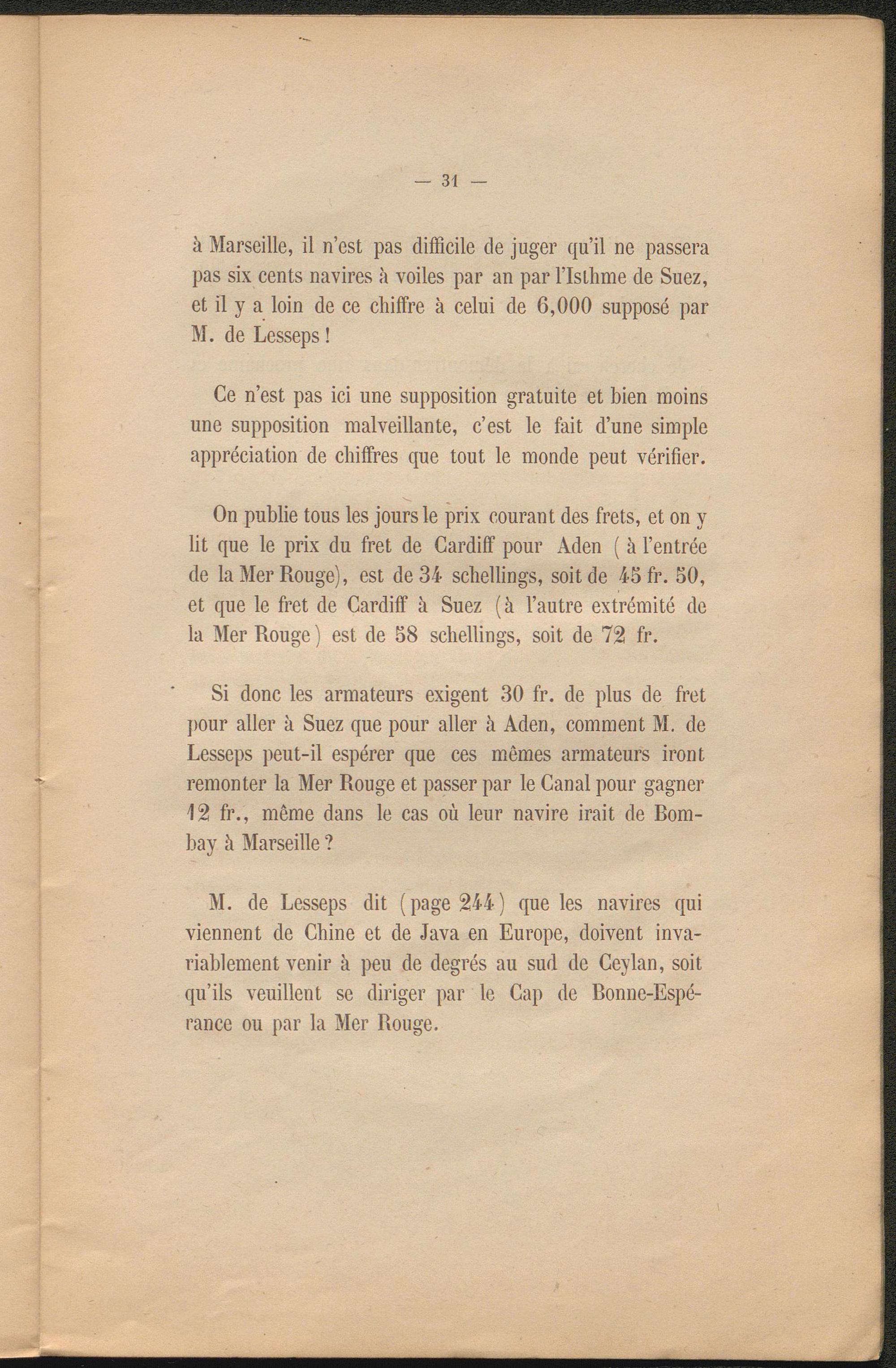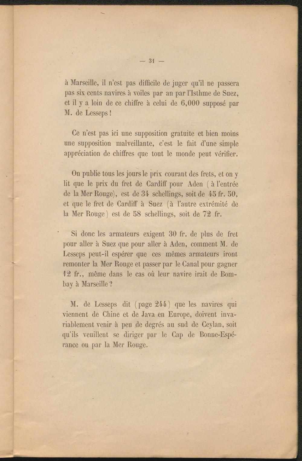 à Marseille, il n’est pas difficile de juger qu’il ne passera pas six cents navires à voiles par an par l’Isthme de Suez, et il y a loin de ce chiffre à celui de 6,000 supposé par M. de Lesseps !