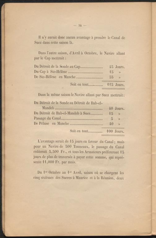 L’avantage serait de 15 jours en faveur du Canal ; mais pour un Navire de 500 Tonneaux, le passage du Canal coûterait 5,500 Fr., et tous les Armateurs préféreront 15 jours de plus de traversée à payer cette somme, qui représente 11,000 Fr. par mois.