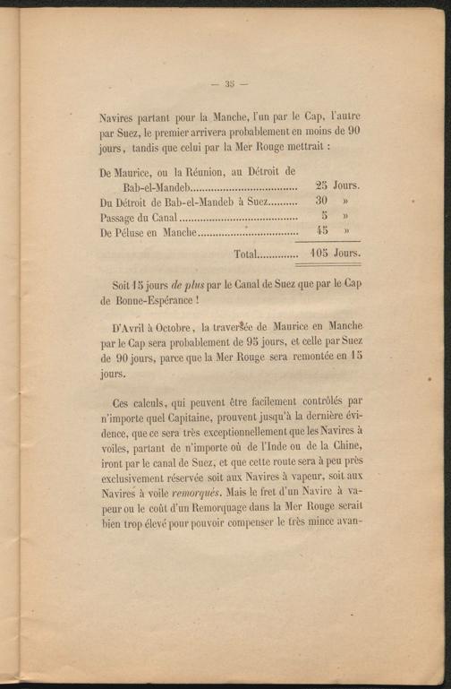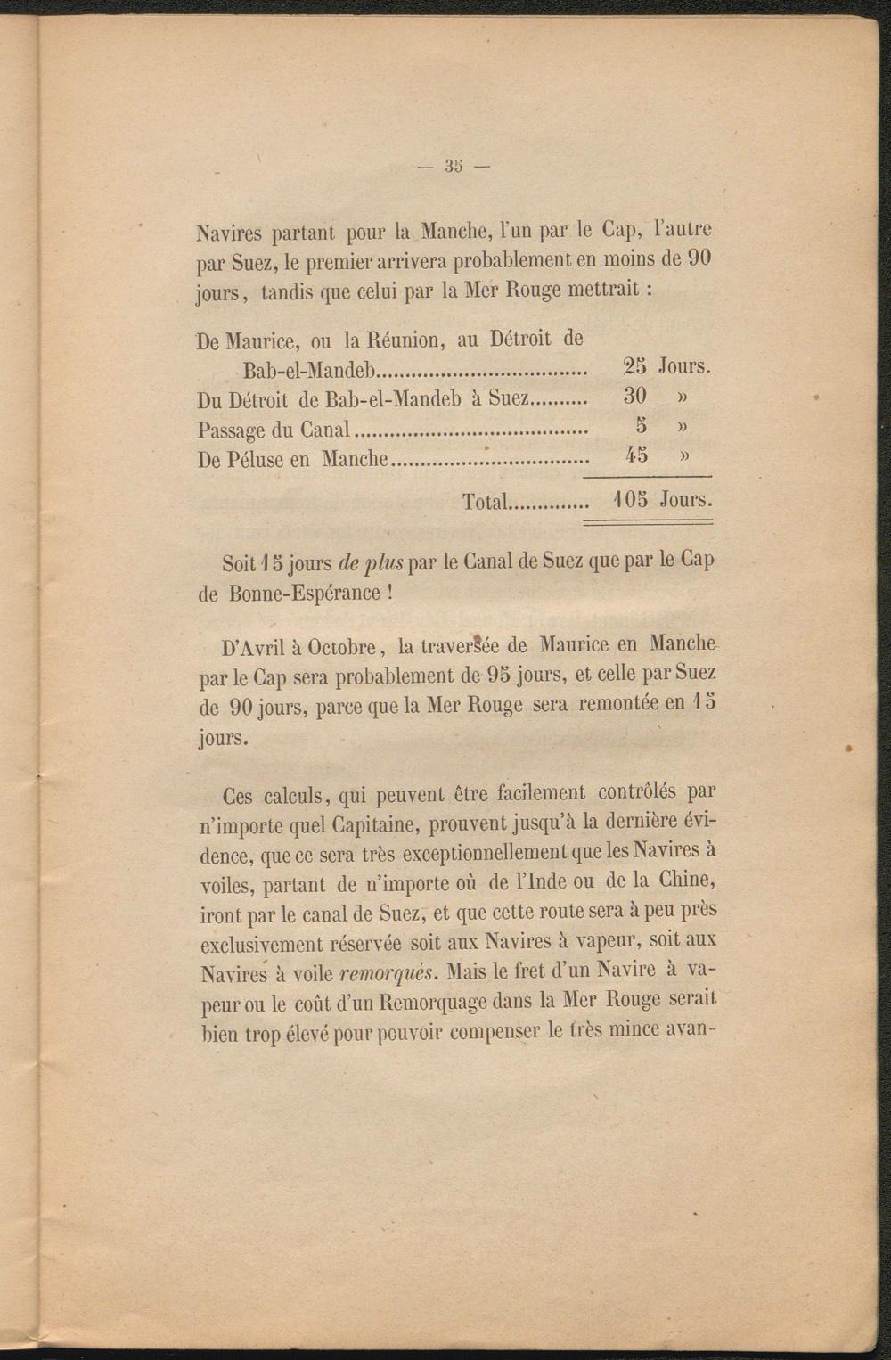 Ces calculs, qui peuvent être facilement contrôlés par n’importe quel Capitaine, prouvent jusqu’à la dernière évidence, que ce sera très exceptionnellement que les Navires à voiles, partant de n’importe où de l’Inde ou de la Chine, iront par le canal de Suez, et que cette route sera à peu près exclusivement réservée soit aux Navires à vapeur, soit aux Navires à voile remorqués. Mais le fret d’un Navire à vapeur ou le coût d’un Remorquage dans la Mer Rouge serait bien trop élevé pour pouvoir compenser le très mince avan-