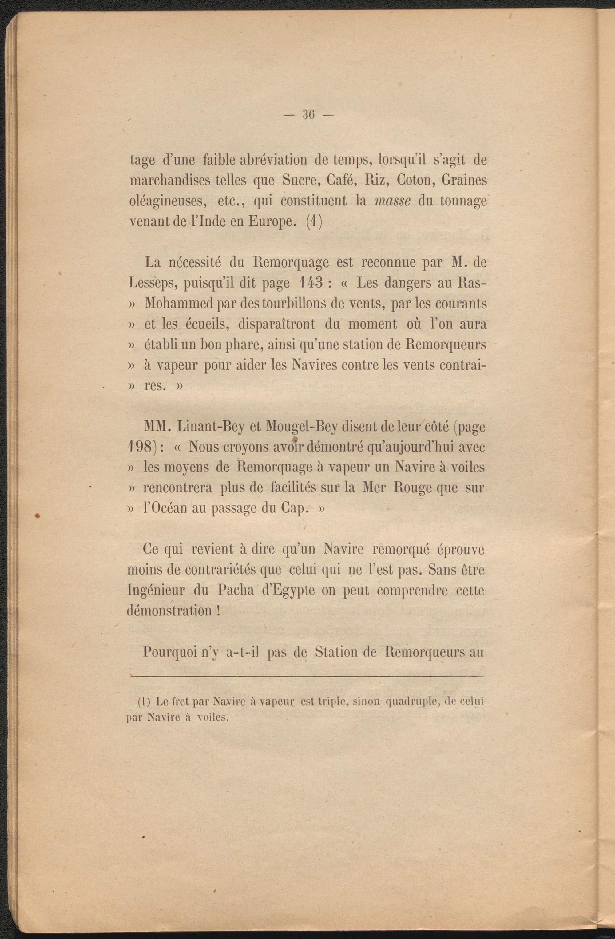 La nécessité du Remorquage est reconnue par M. de Lesseps, puisqu’il dit page 143 : « Les dangers au Ras- » Mohammed par des tourbillons de vents, par les courants » et les écueils, disparaîtront du moment où l’on aura » établi un bon phare, ainsi qu’une station de Remorqueurs » à vapeur pour aider les Navires contre les vents contrai- » res. »