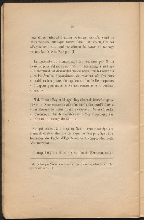 MM. Linant-Rey et Mougel-Rey disent de leur côté (page 198) : « Nous croyons avoir démontré qu’aujourd’hui avec » les moyens de Remorquage à vapeur un Navire à voiles » rencontrera plus de facilités sur la Mer Rouge que sur a l’Océan au passage du Cap. »