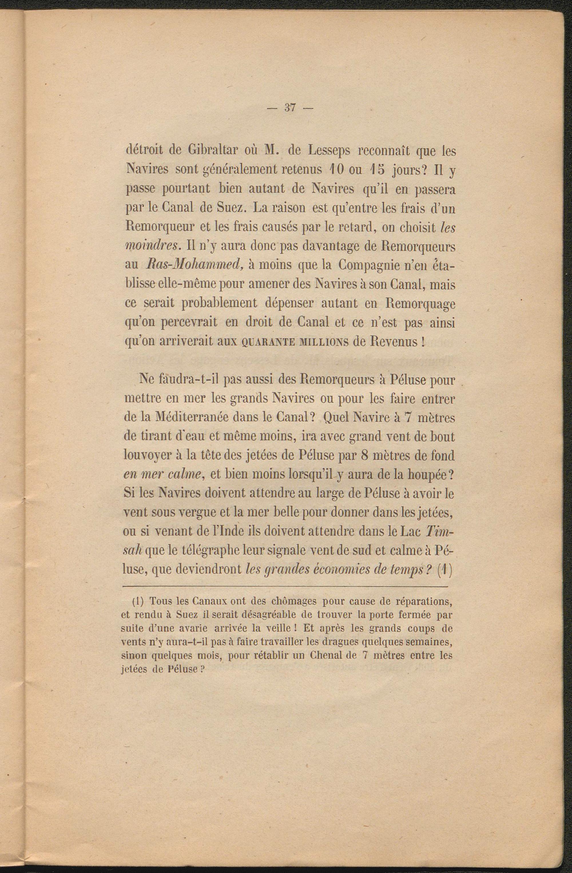 Ne faudra-t-il pas aussi des Remorqueurs à Péluse pour mettre en mer les grands Navires ou pour les faire entrer de la Méditerranée dans le Canal? Quel Navire à 7 mètres de tirant d'eau et même moins, ira avec grand vent de bout louvoyer à la tête des jetées de Péluse par 8 mètres de fond en mer calme , et bien moins lorsqu’il y aura de la houpée? Si les Navires doivent attendre au large de Péluse à avoir le vent sous vergue et la mer belle pour donner dans les jetées, ou si venant de l’Inde ils doivent attendre dans le Lac Tim- sah que le télégraphe leur signale vent de sud et calme à Péluse, que deviendront les grandes économies de temps ? (1 )