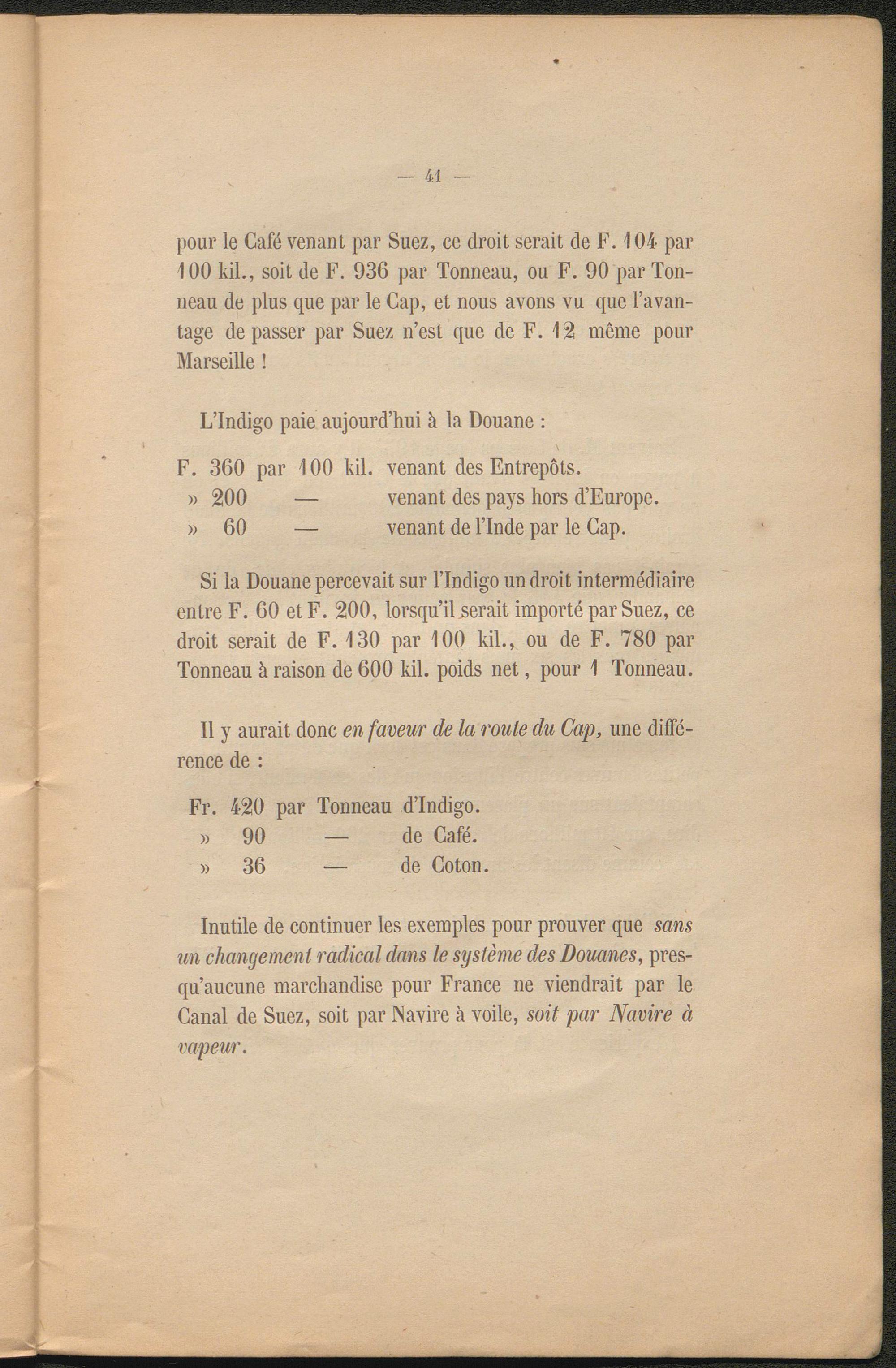 Inutile de continuer les exemples pour prouver que sans un changement radical dans le système des Douanes, pres- qu’aucune marchandise pour France ne viendrait par le Canal de Suez, soit par Navire à voile, soit par Navire à vapeur.