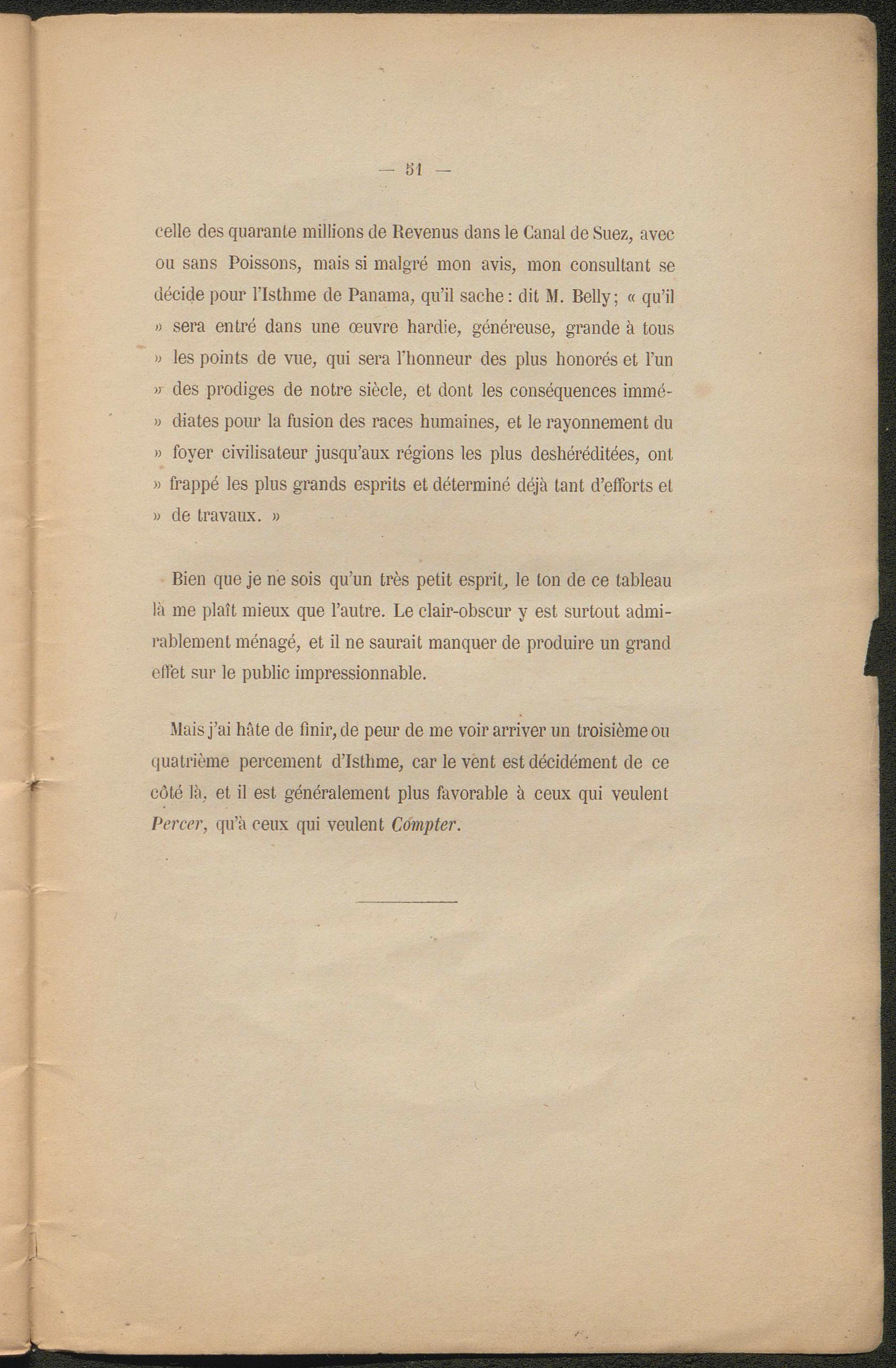 celle des quarante millions de Revenus dans le Canal de Suez, avec ou sans Poissons, niais si malgré mon avis, mon consultant se décide pour l’Isthme de Panama, qu’il sache : dit M. Belly ; « qu’il » sera entré dans une œuvre hardie, généreuse, grande à tous » les points de vue, qui sera l’honneur des plus honorés et l’un » des prodiges de notre siècle, et dont les conséquences immé- » diates pour la fusion des races humaines, et le rayonnement du » foyer civilisateur jusqu’aux régions les plus deshéréditées, ont » frappé les plus grands esprits et déterminé déjà tant d’efforts et » de travaux. »