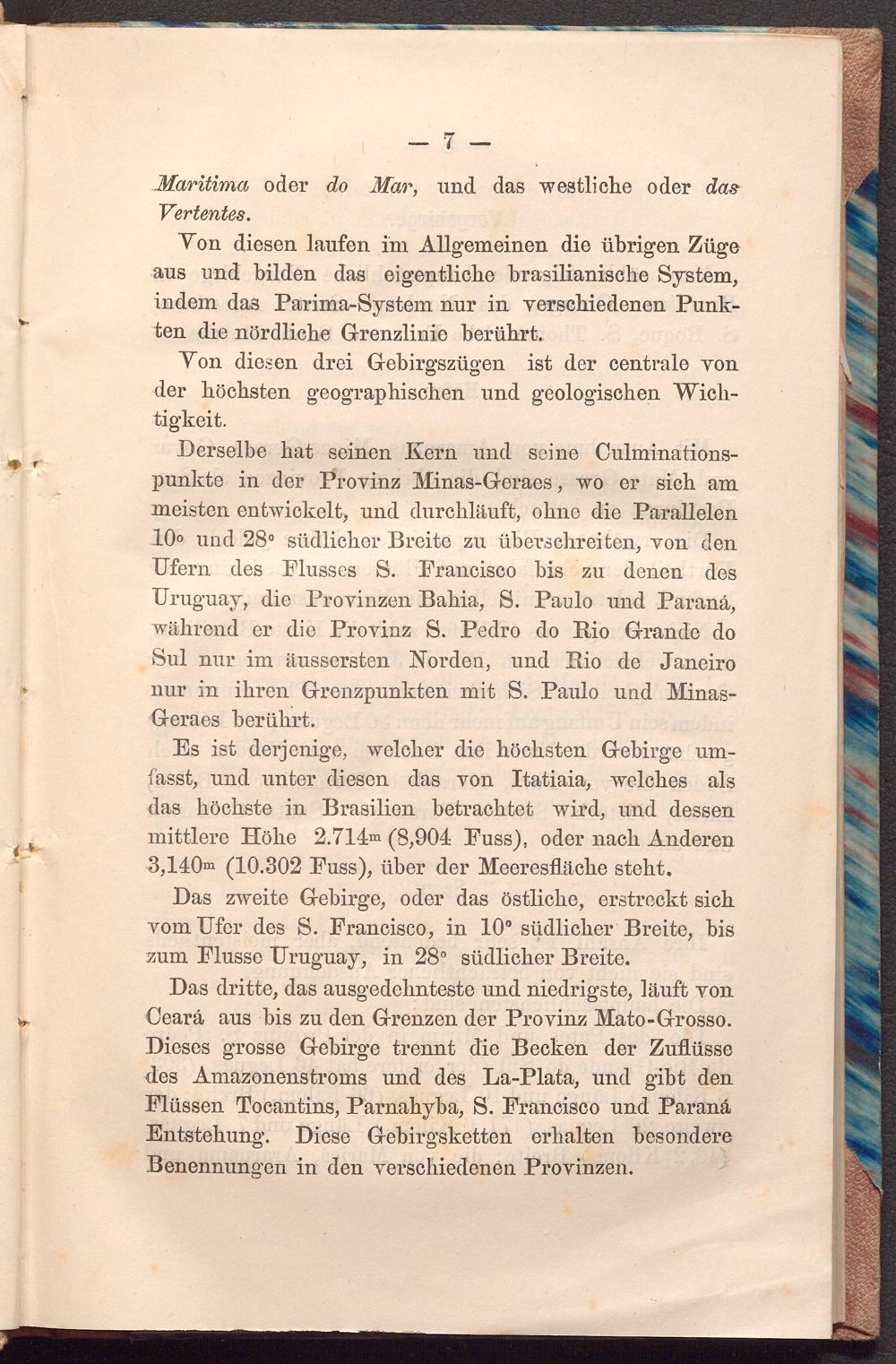 Derselbe hat seinen Kern und seine Culminationspunkte in der Provinz Minas- Geraes, wo er sich am meisten entwickelt, und durchläuft, ohne die Parallelen 10° und 28° südlicher Breite zu überschreiten, von den Ufern des Flusses S. Francisco bis zu denen des Uruguay, die Provinzen Bahia, S. Paulo und Paraná, während er die Provinz S. Pedro do Rio Grande do Sul nur im äussersten Norden, und Rio de Janeiro nur in ihren Grenzpunkten mit S. Paulo und MinasGeraes berührt.